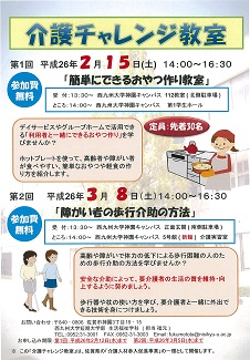 毎年本学で実施している「介護チャレンジ教室」を、2014年2月15日(土)と3月8日(土)に開催します。今回は家や介護現場で役立つ、高齢者や障がい者のための生活支援技術を紹介します。