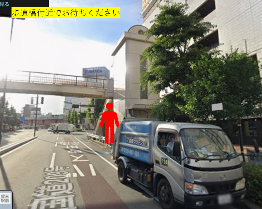 送迎バスは路上駐車します。通行の妨げにならないよう、歩道橋付近の建物寄りでお待ちください。