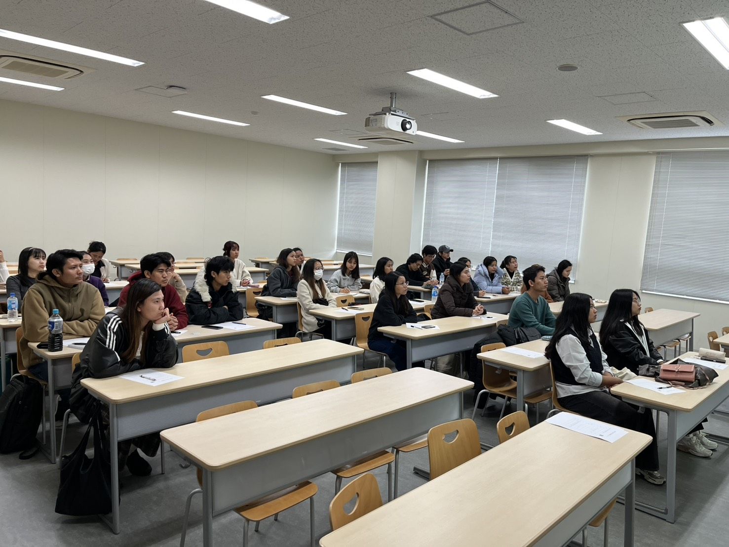 令和8年2月25日(水)、株式会社AKIの瀬頭様をお迎えし、本学留学生を対象とした就職説明会を開催しました。今回は、多文化コース1年生34名、食健康コース1年生13名、計47名の留学生を対象に実施し、日本での就職に向けて真剣な姿勢で説明に耳を傾けていました![]()