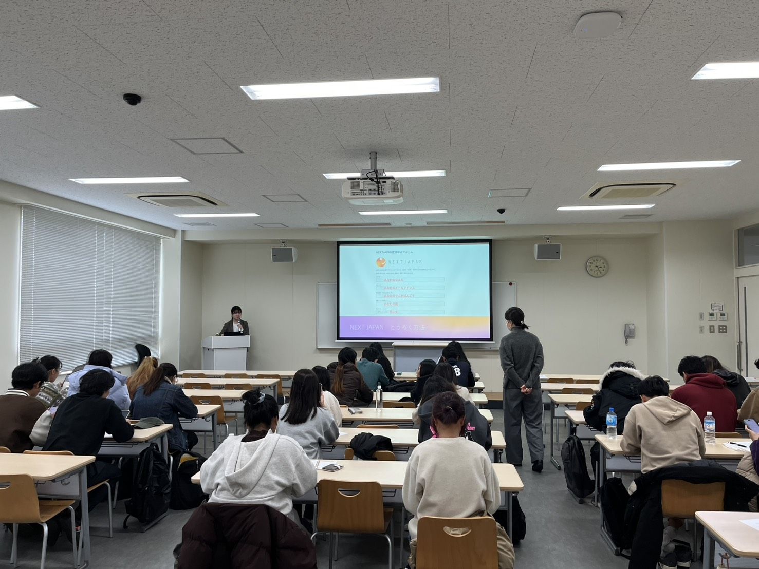 On Wednesday, February 25, 2026, a job information session for international students was held at our university, welcoming Ms. Segashira from AKI Co., Ltd. A total of 47 international students participated in the session, including 34 first-year students from the Multicultural Studies Department and 13 first-year students from the Food and Health Department. The participants listened attentively and showed a strong interest in pursuing employment in Japan.![]()