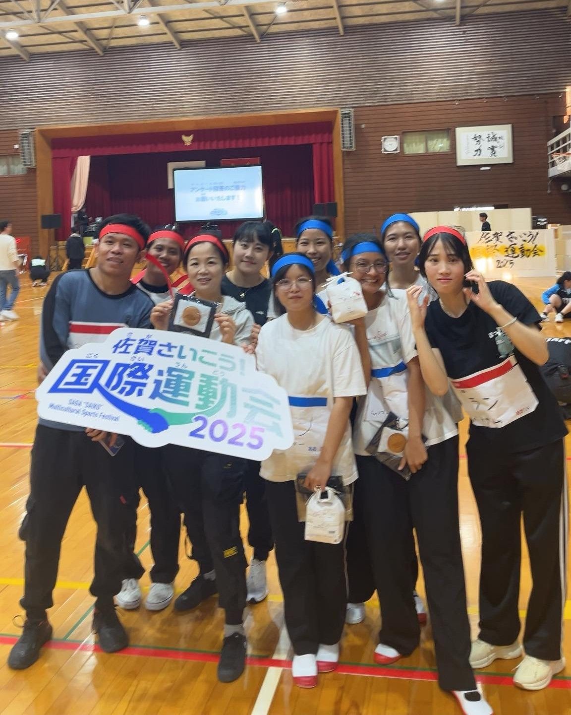 On Sunday, November 16, this year, Saga Saikou! International Sports Festival 2025 was held at the gymnasium of Saga Prefectural Saga Commercial High School. The event was open to all residents of Saga Prefecture regardless of nationality and was lively with many participants.From the University Diversity Center, a total of fourteen students participated under the supervision of Coordinator Liu from China, including thirteen international students from Myanmar enrolled in the Junior College Multicultural Course and one student from the University’s Department of Social Welfare.![]()