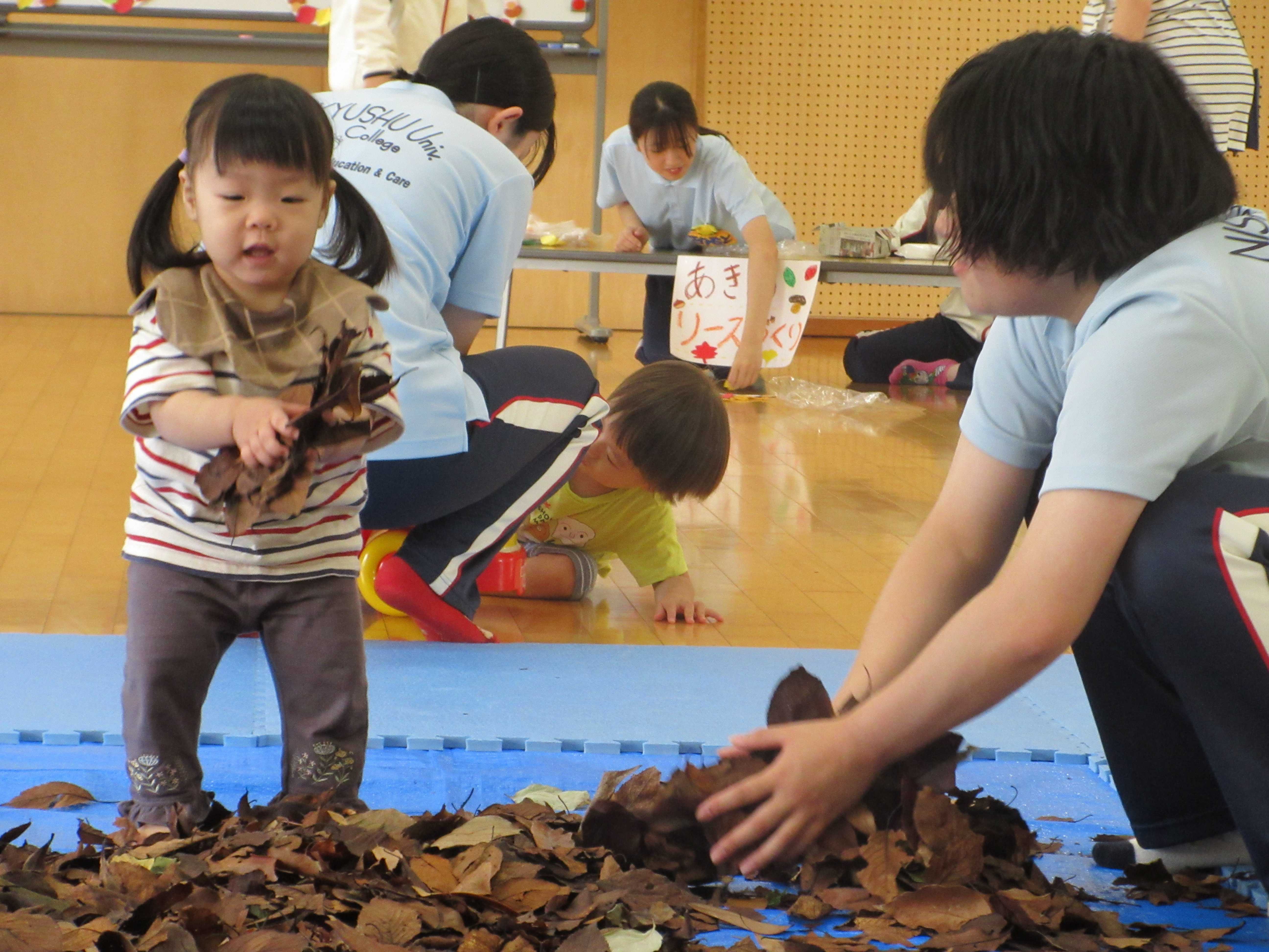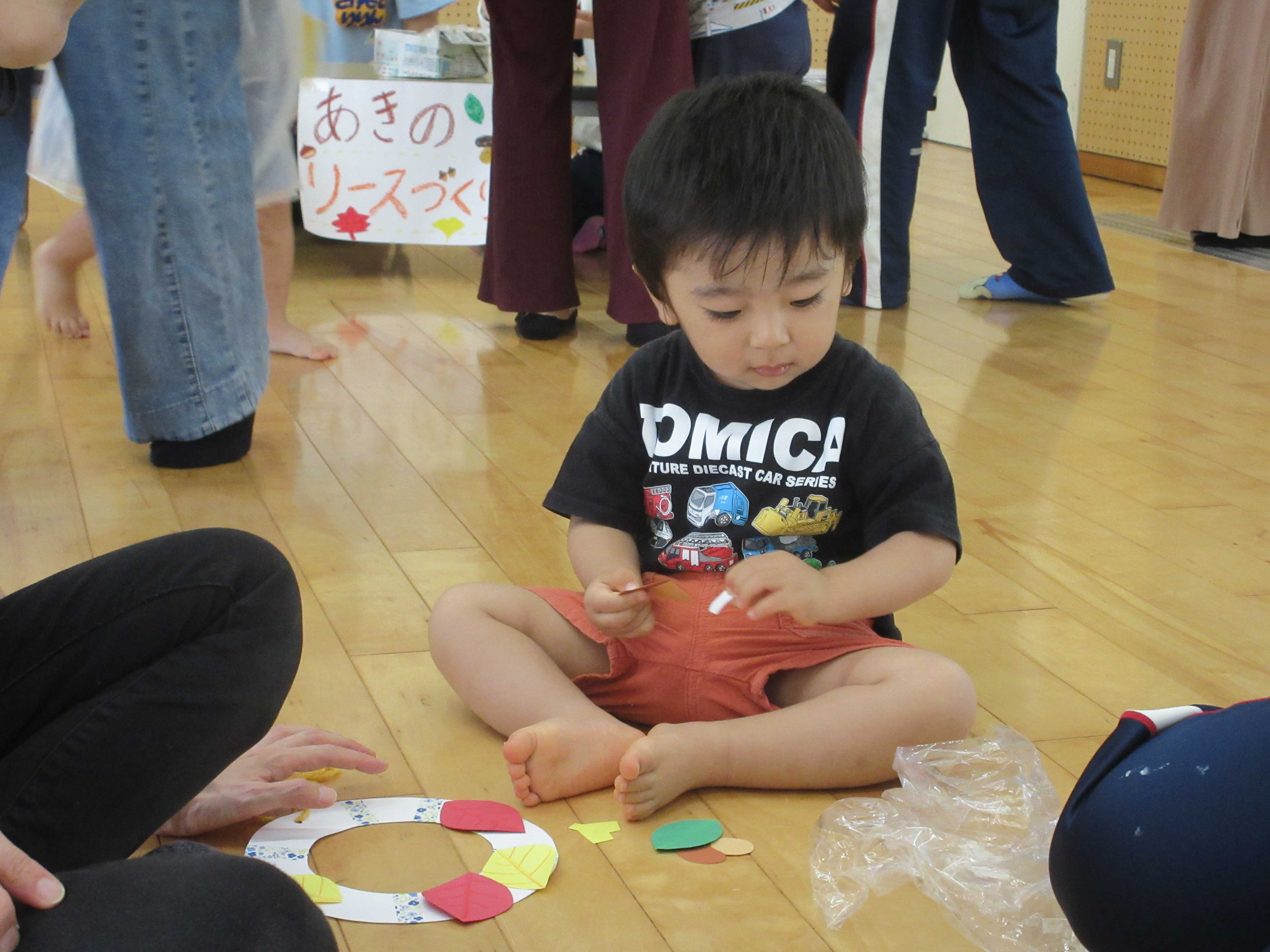 他にも、落ち葉の型紙でリースを作るブースも用意したところ、子どもたちは思い思いに遊びを楽しんでくれました。子どもたちの発想を大切にすると同時に、子どもたちのさらなる発想を広げるための声かけや環境準備の大切さも学んだ次第です。