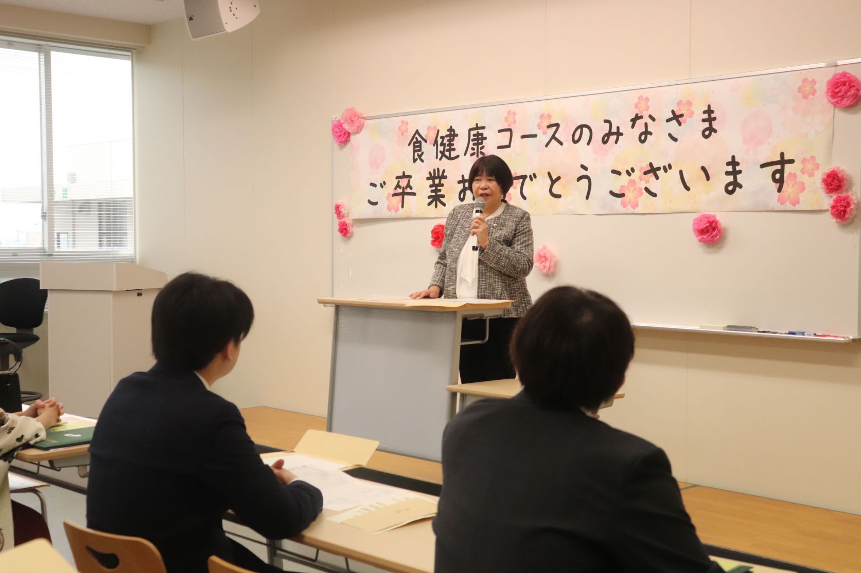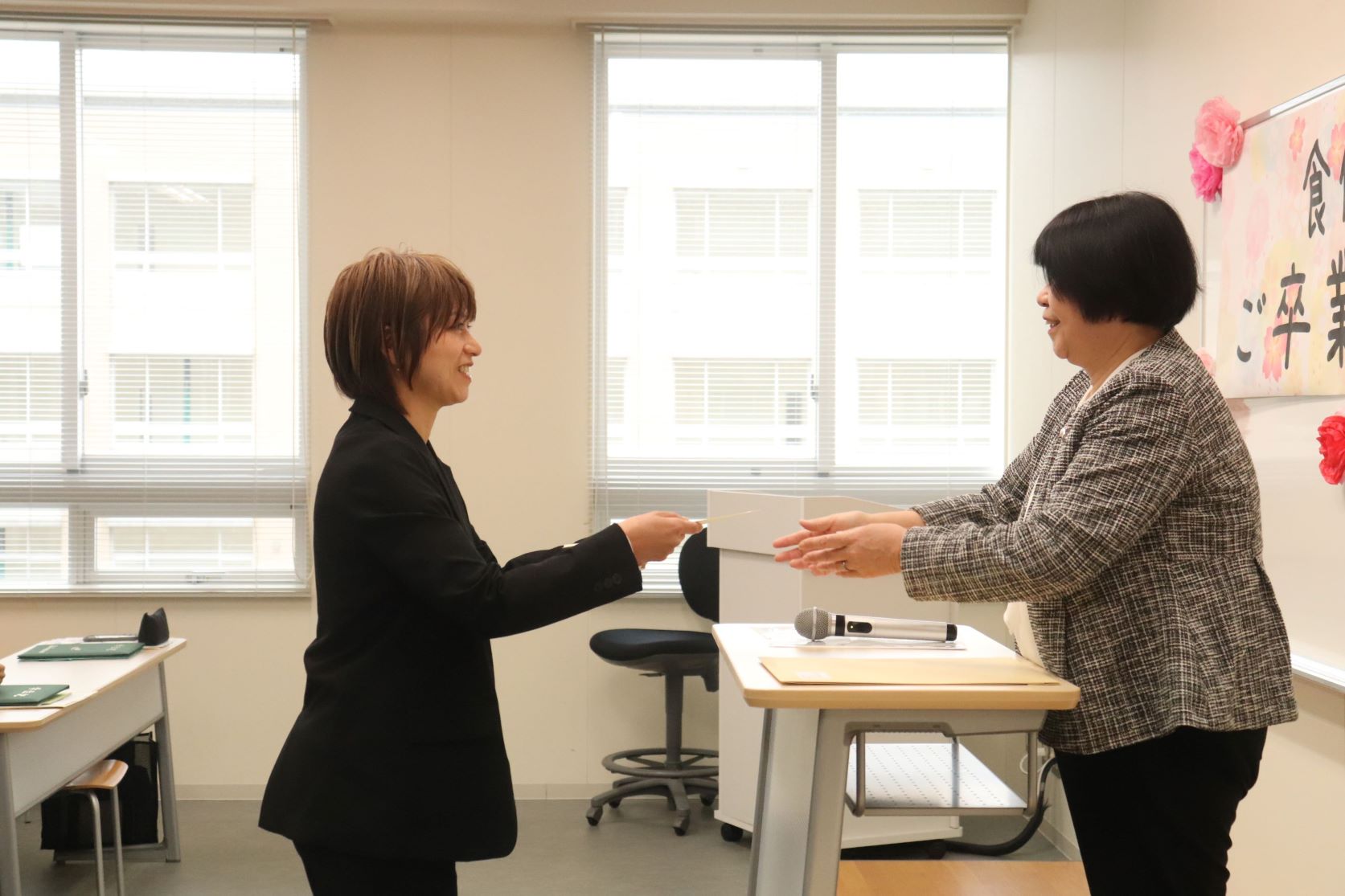 担任の西岡先生より、卒業生一人ひとりに学位記が授与され、栄養士実力認定試験の優秀賞と優良賞の表彰もあわせて行われました。