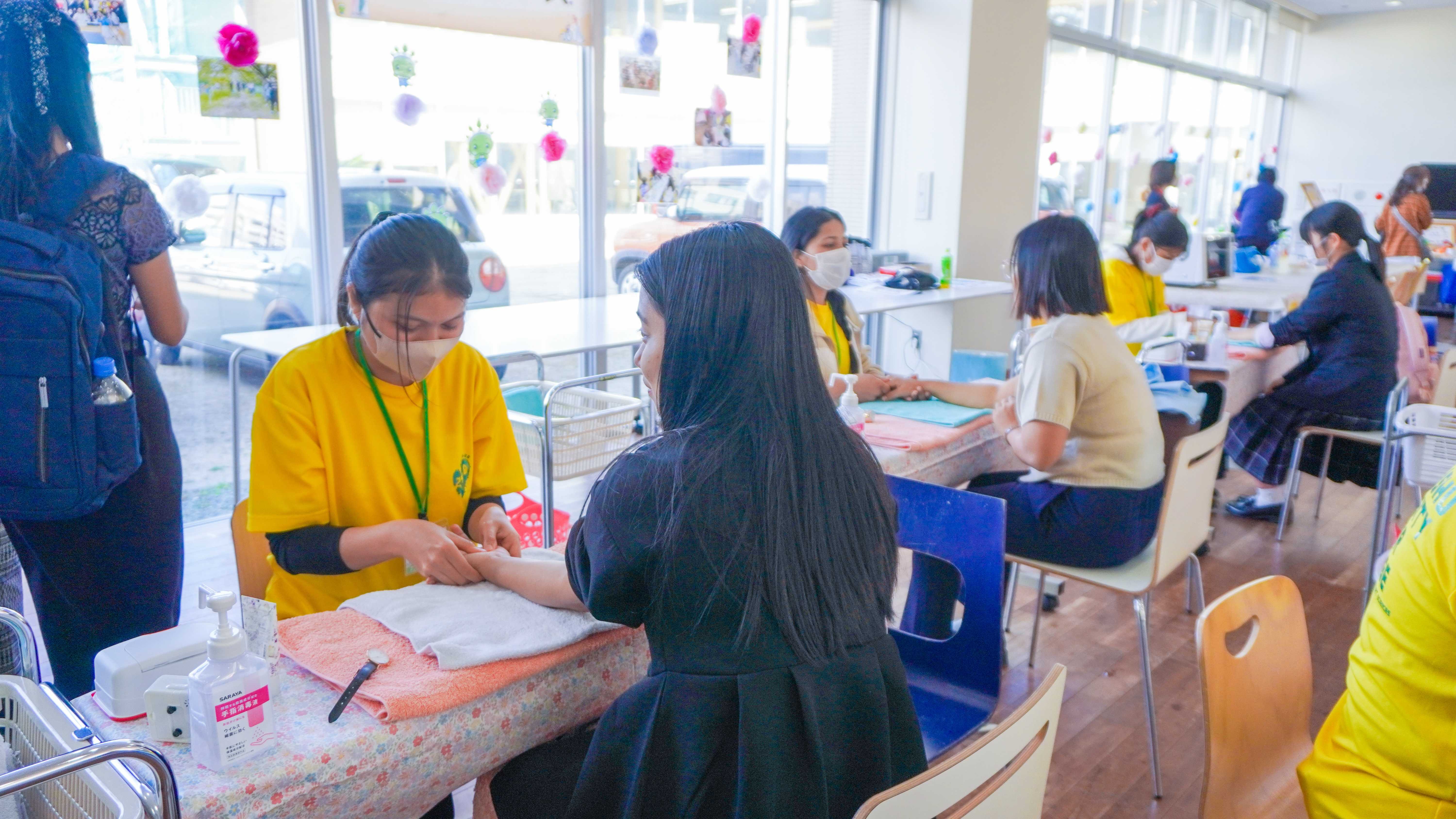 当日は、実際の授業でも取り入れているレクリエーションを体験しながら、介護の楽しさややりがいに触れていただきました。ハンドケア体験では、リラックスした雰囲気の中で「人に触れるケア」の心地よさを感じていただくことができました。