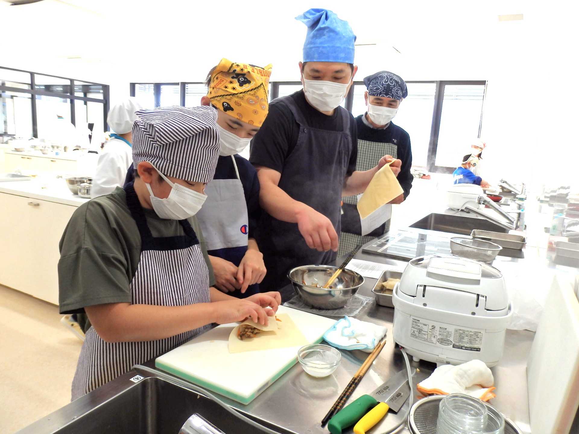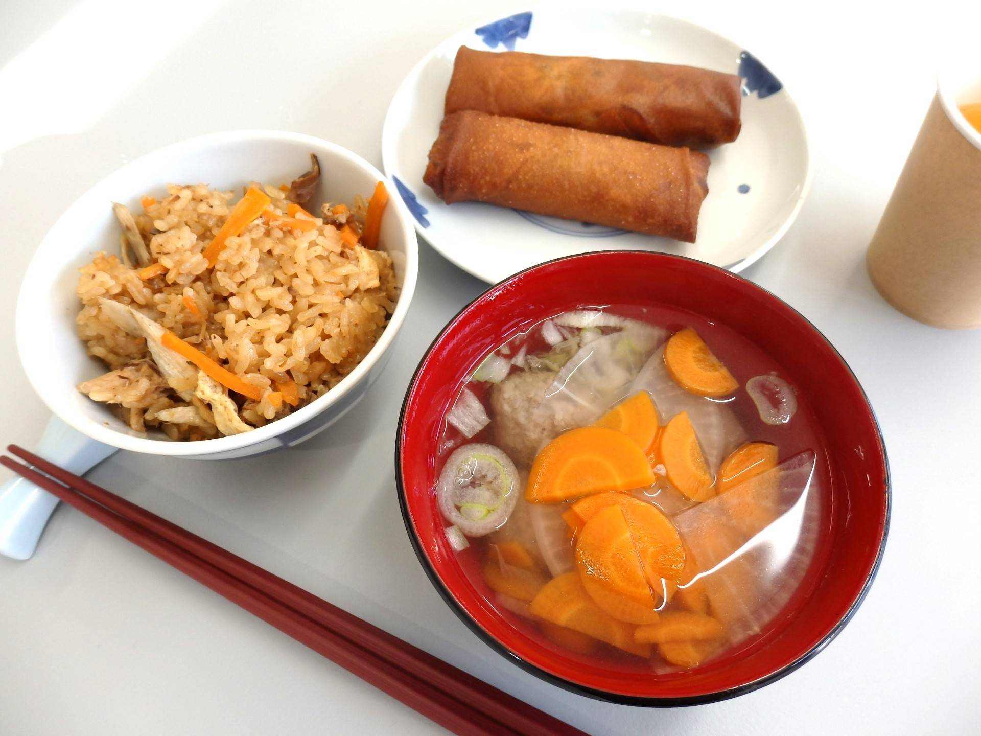 本日の調理実習では、さばの五目春巻きとイワシのつみれ汁とさばの炊き込みご飯をつくりました