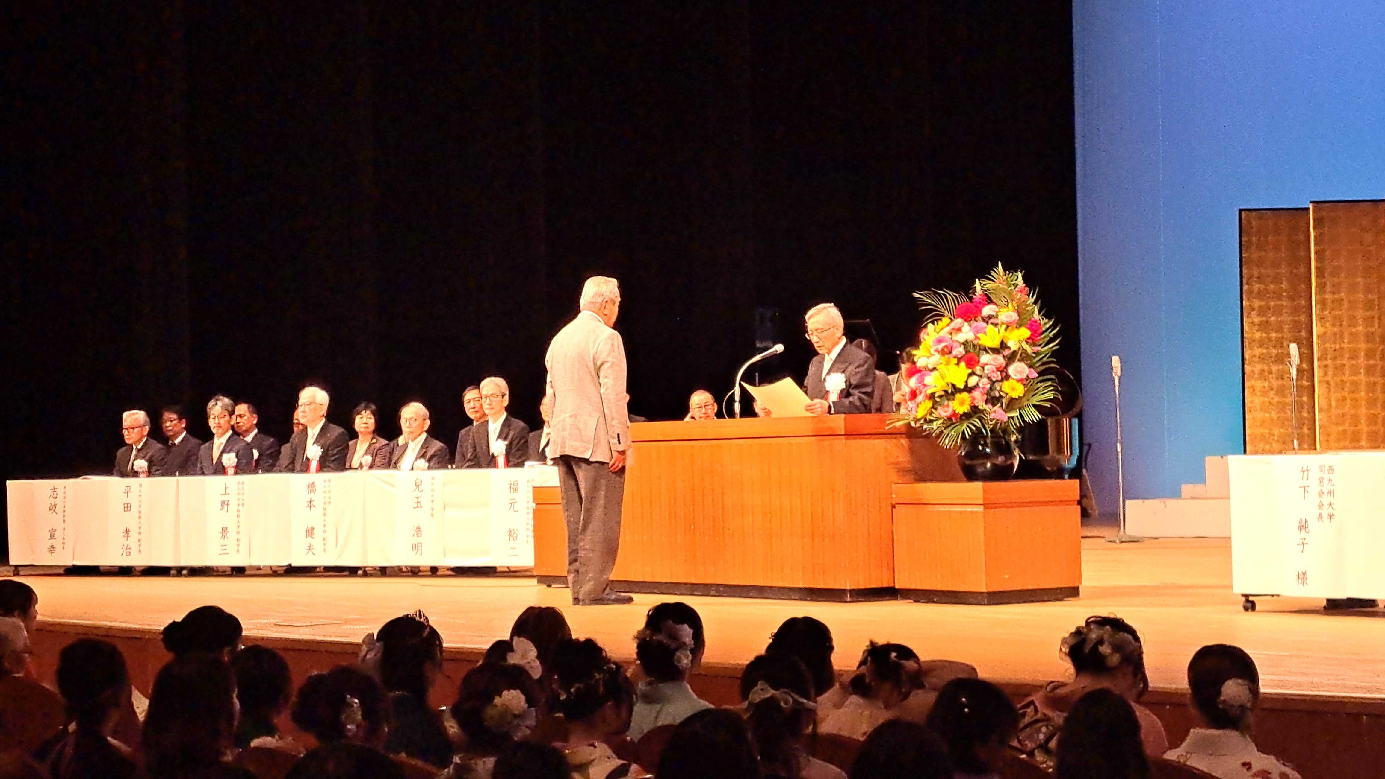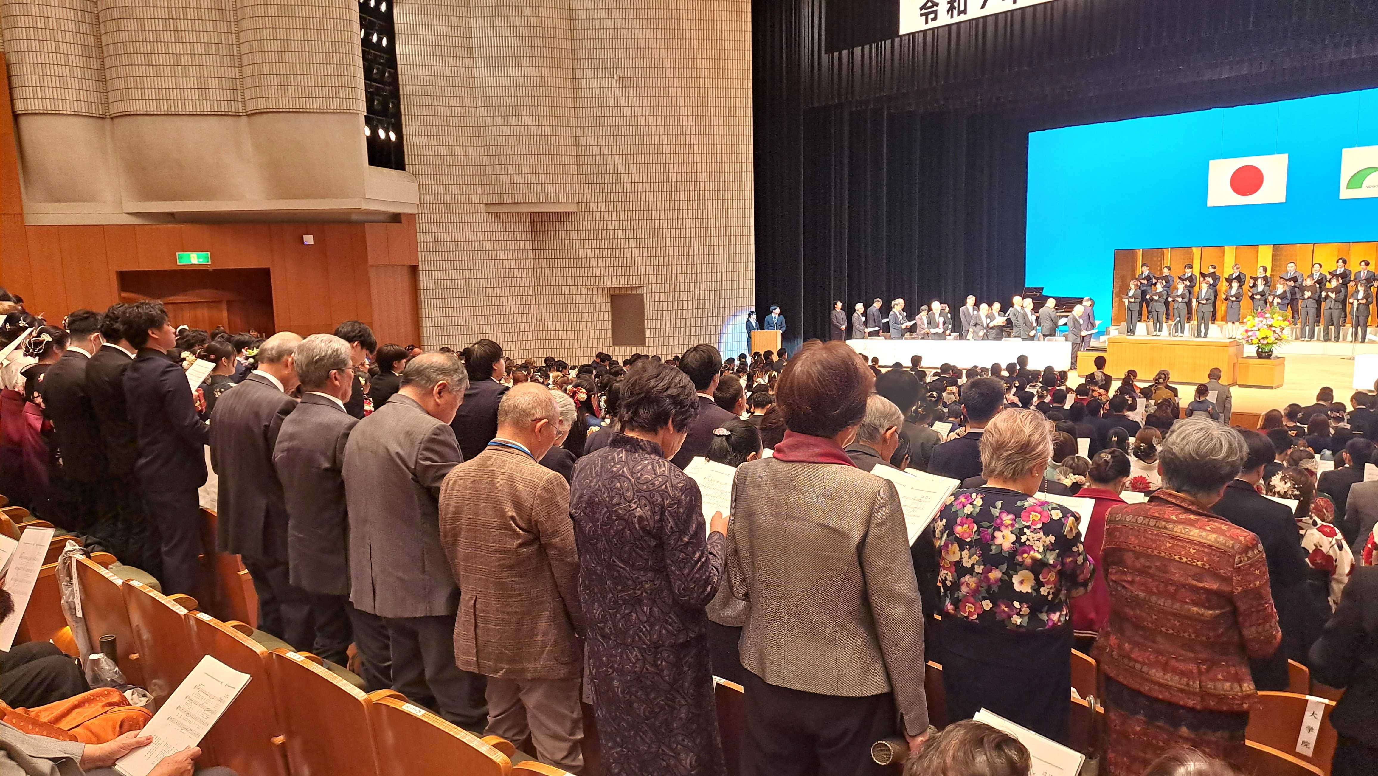式の最後に、校歌斉唱がありステージ上の学生さん達のコーラスに合わせ