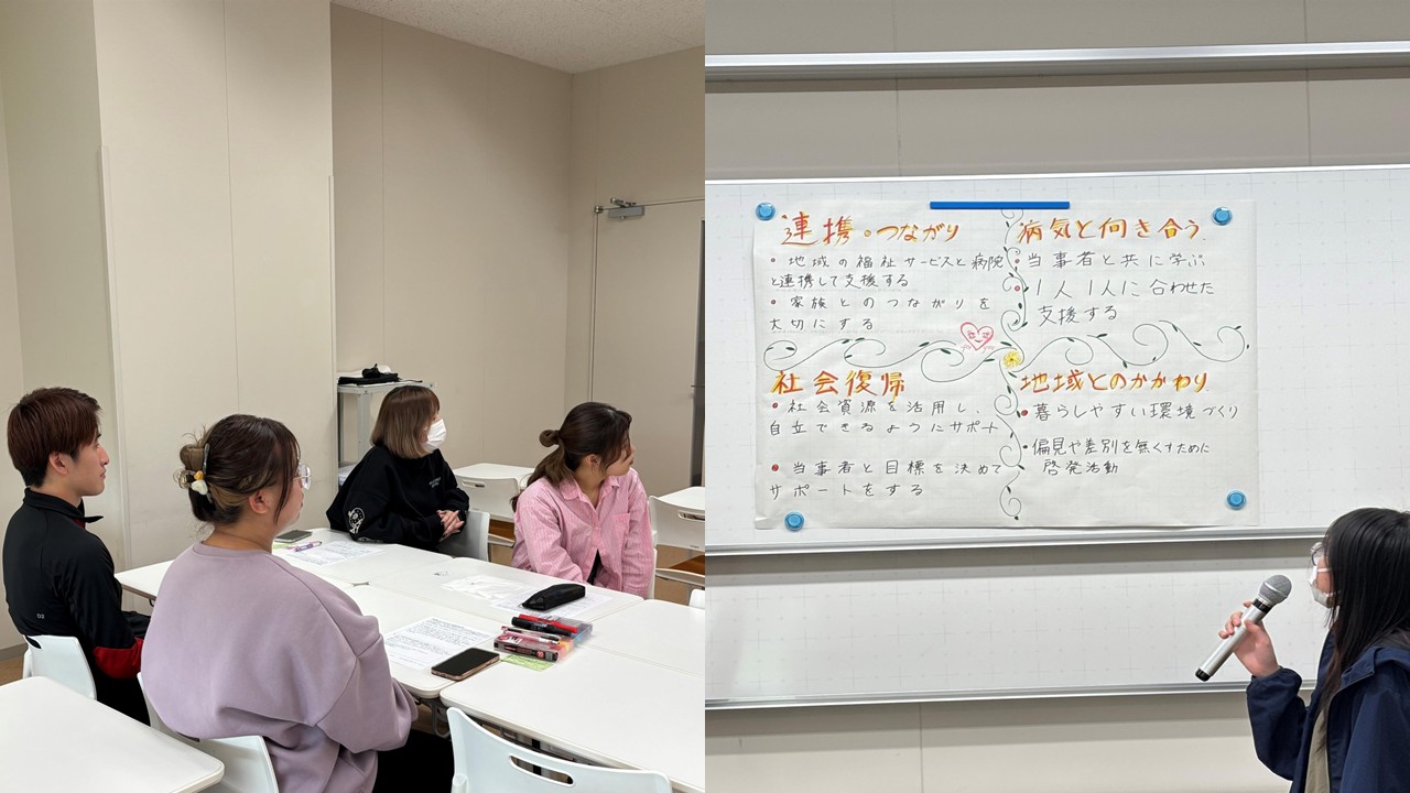 精神障がい当事者やその家族とのかかわりを意識しながら、それぞれのプレゼンテーションの内容を聞くことで、メンタルヘルスの専門職である精神保健福祉士について学びました