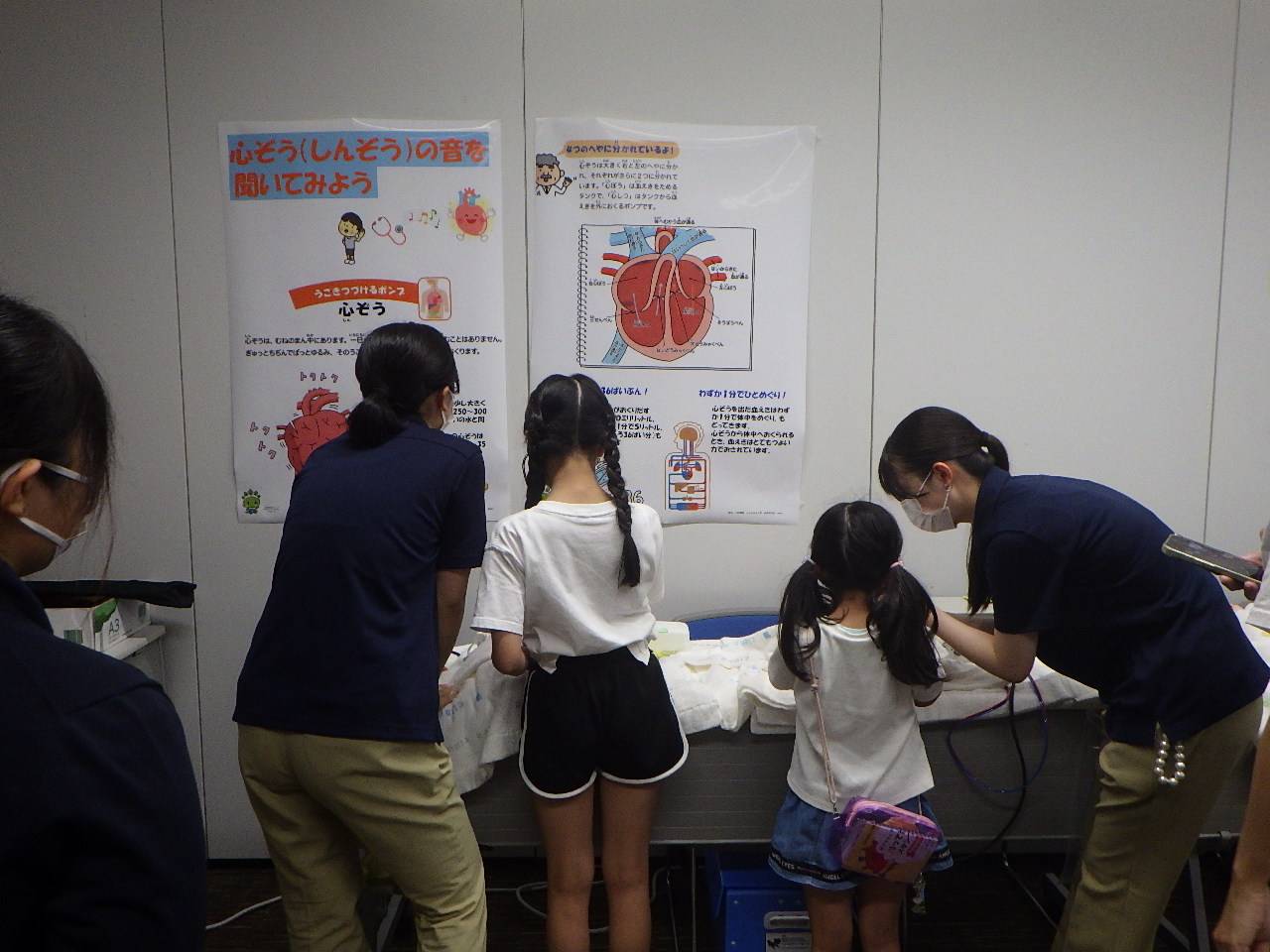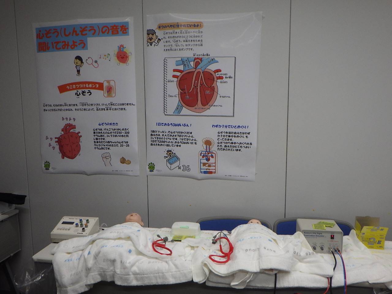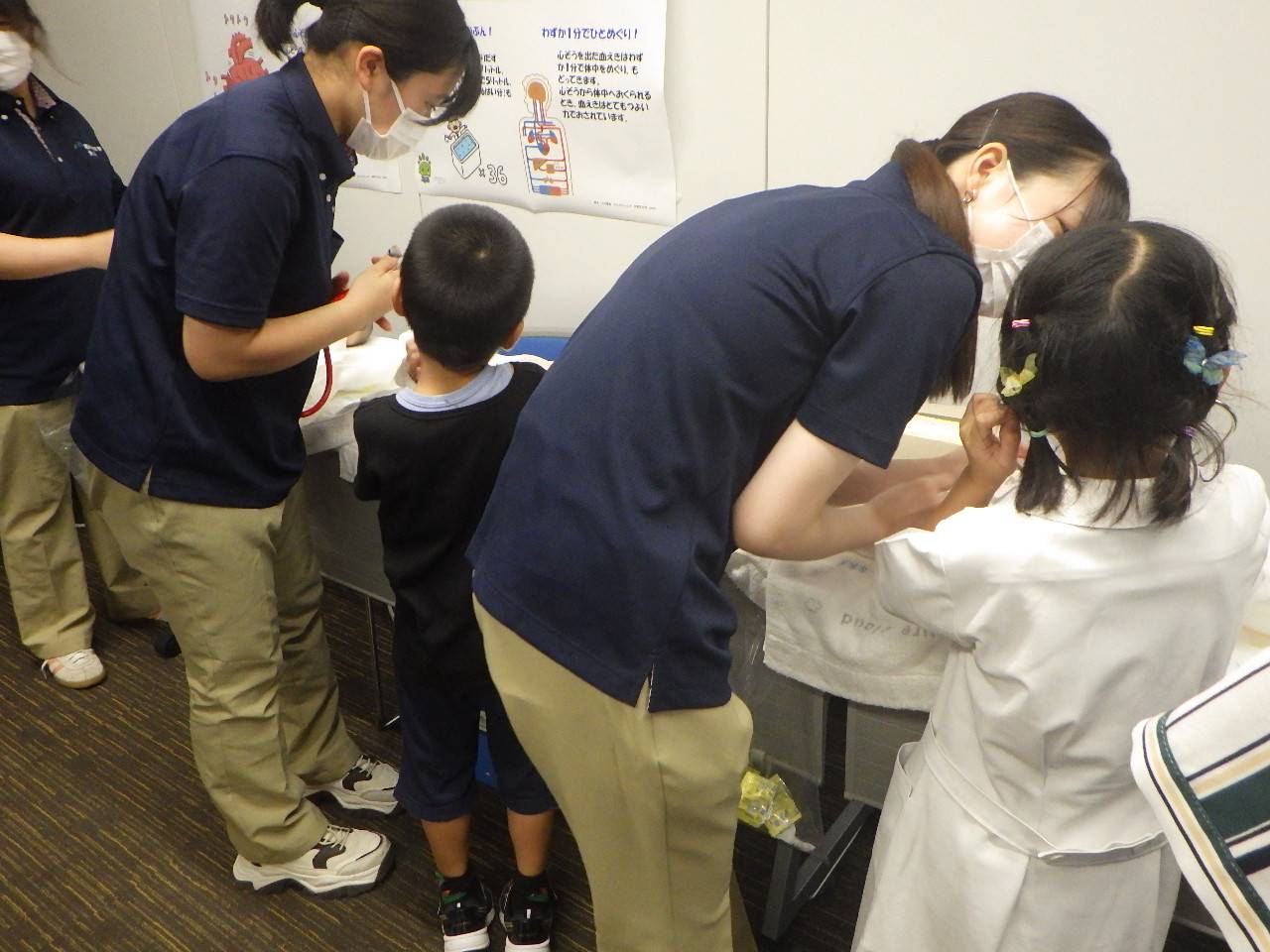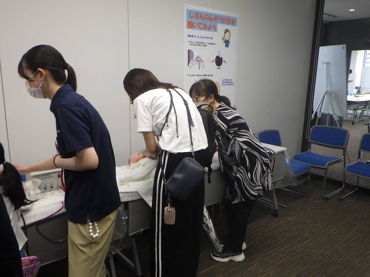 赤ちゃんシミュレーターの聴診体験と白衣を着て写真撮影
