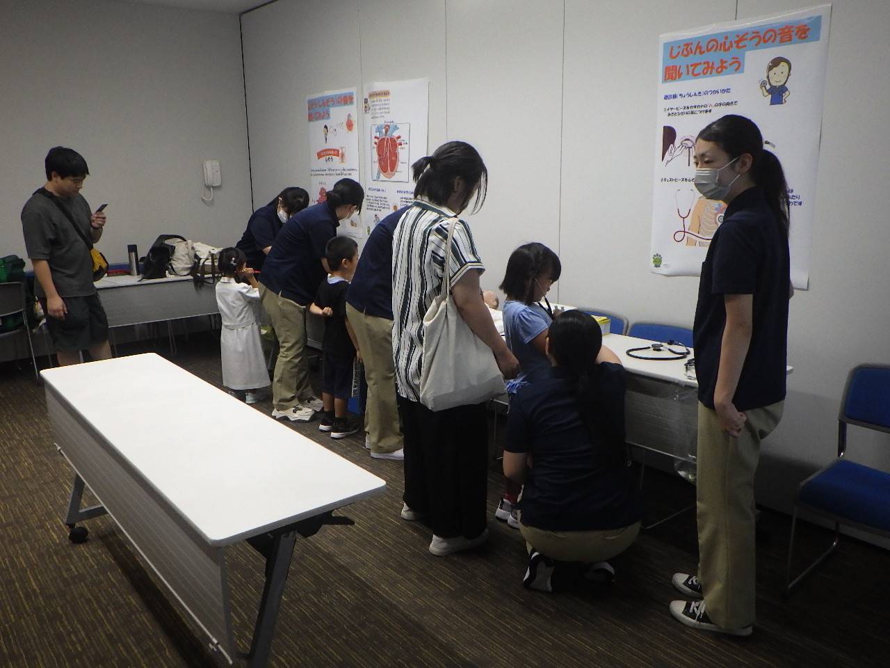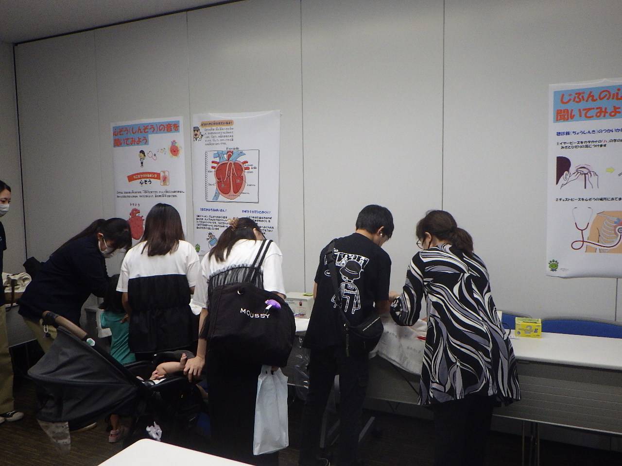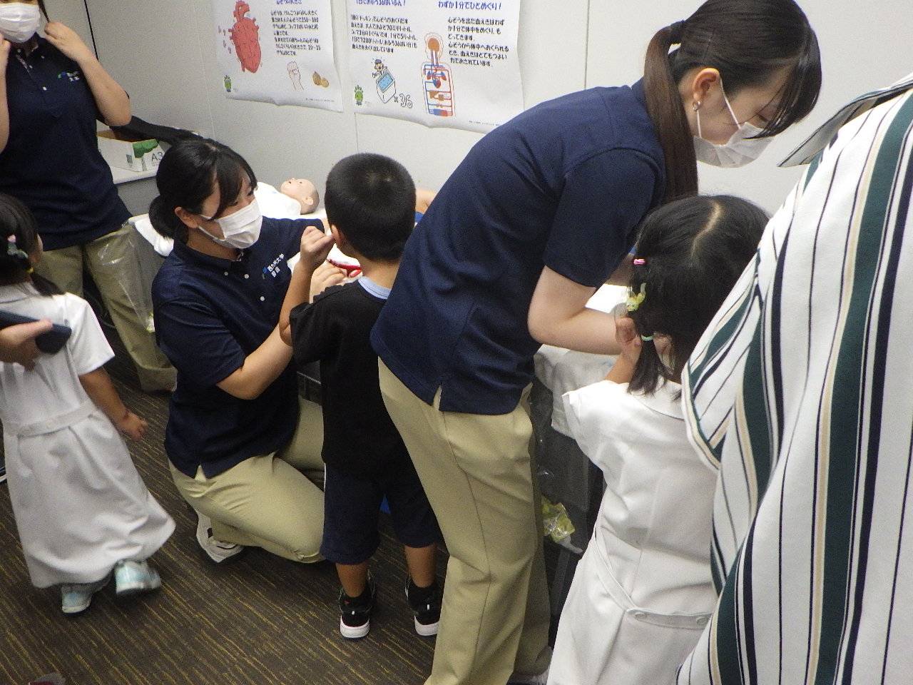 西九州大学看護学部も2年生6名がボランティアとして、また、プレパパママ教室・屋根瓦教育の第一人者として新聞、マスコミでも話題となっておられる母性看護学領域の井上先生をはじめ、基礎看護学領域の大庭先生、看護学部小城キャンパスに思い入れが深い奥事務課長、成人看護学領域の馬塲先生でブースに参画しました。参画したブースは、赤ちゃんシミュレーターの聴診体験と白衣を着た写真撮りでした。予想以上の大盛況で、看護学部のブースには250名の来場者があり、体験を楽しまれてました。ご来場いただき、ありがとうございました。また、学生ボランティアとして参加してくれた学生もお疲れ様でした。