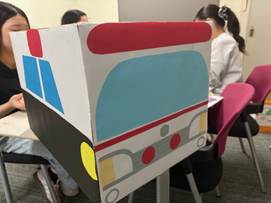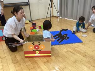 どうやったら、子どもたちが楽しくおもちゃを片付けてくれるだろう」と学生たちが考え、「アンパンマン」と「乗り物」のお片付けボックスを作成しました。そのねらいもばっちりで、楽しく遊んだ後は、自分たちでドンドンお片付けをすることができました