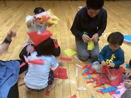 今回の設定遊びは「はながみ遊び」です。花紙を拭いたり、ちぎったり、舞い上げたり、袋に入れたりと、「やりたい」ことを見つけて、親子で遊びました。