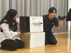 学生たちの考えた絵本の読み聞かせの時間もあります。子どもたちが興味を持ってくれるように、ペープサートを作成し、「触れる」「動かせる」楽しみを取り入れました。子どもたちも大満足。最後の自由遊びでは、ペープサートを離さず遊ぶ子どもの姿も見られました。気に入ってくれたのでしょうね