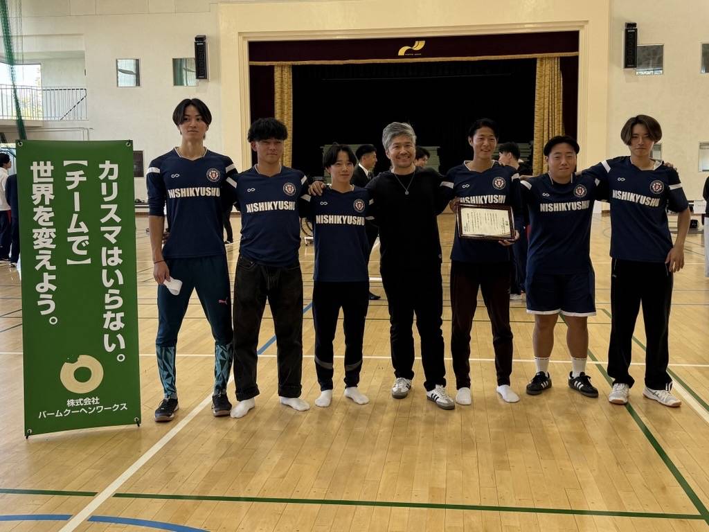 永原学園は令和7年9月に、株式会社バームクーヘンワークスとのスポンサーシップ契約を締結し、スポーツサークルの活動に必要な資金提供を受けることになりました! スポーツ強化指定種目のうち4つのサークル(軟式野球、男子バレー、女子バレー、男子サッカー)がユニフォーム等の物品を支援いただけることになり、11月の学園祭で目録が支給されました。