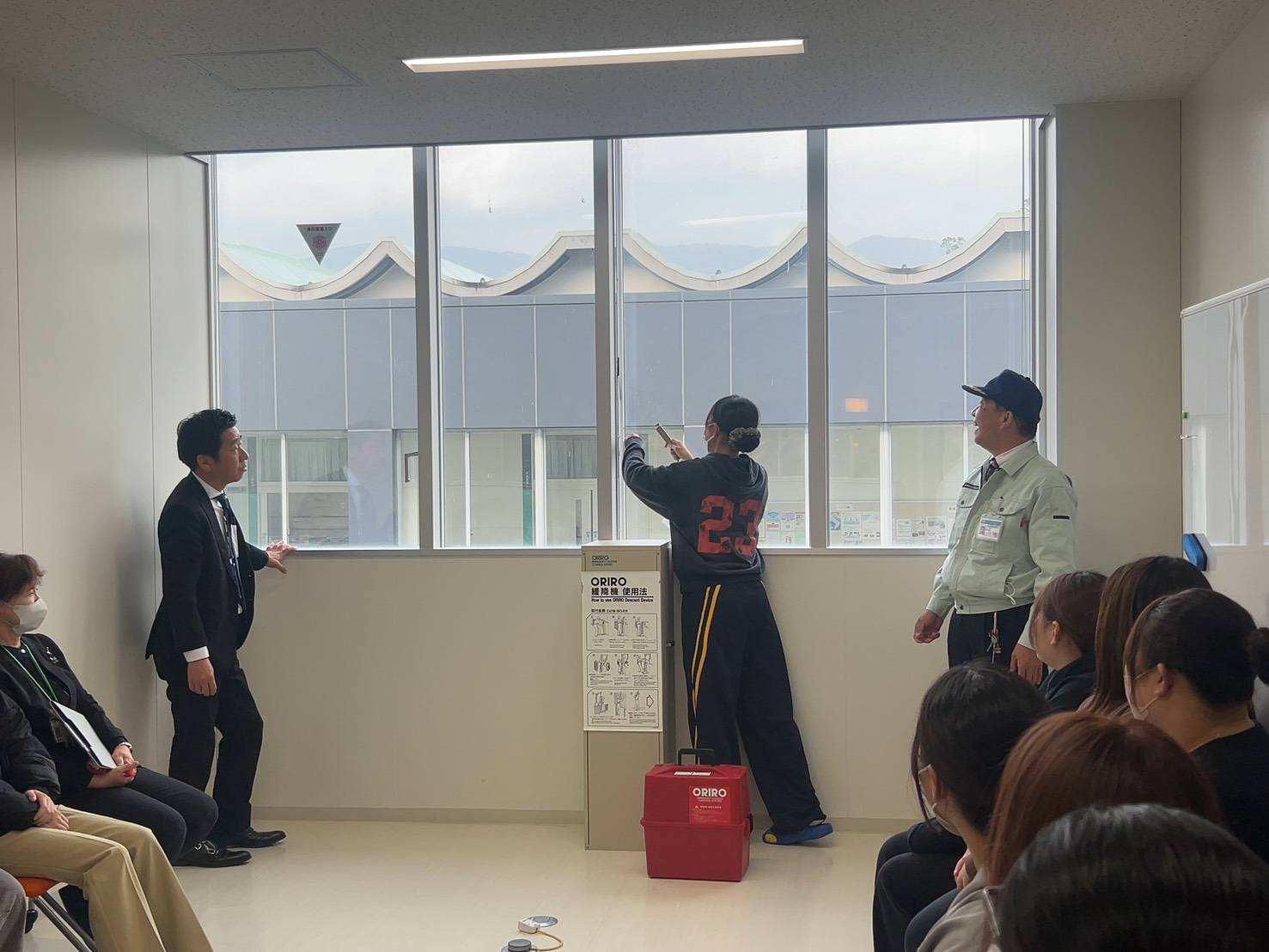 また、講評後には2号館の避難器具(ORIRO)についての説明も行われ、