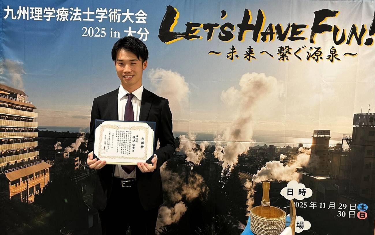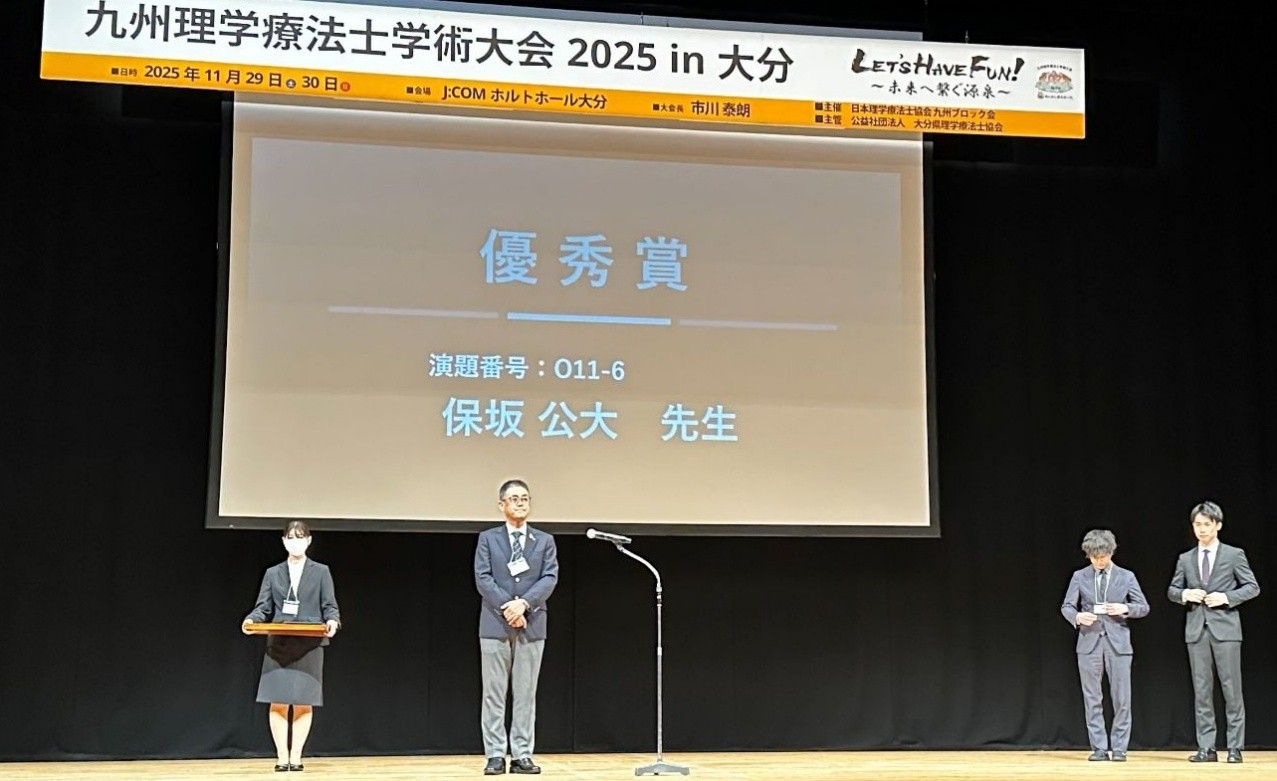 2025年11月29日~30日にJ:COM ホルトホール大分で開催された「九州理学療法士学術大会2025in大分」において,大学院生の保坂公大さん(久留米リハビリテーション病院)が「優秀賞」を受賞しました。