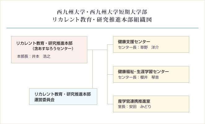 リカレント教育・研究推進本部のもとには、「健康支援センター」、「健康福祉・生涯学習センター」、「産学官連携推進室」の3部門が置かれています。