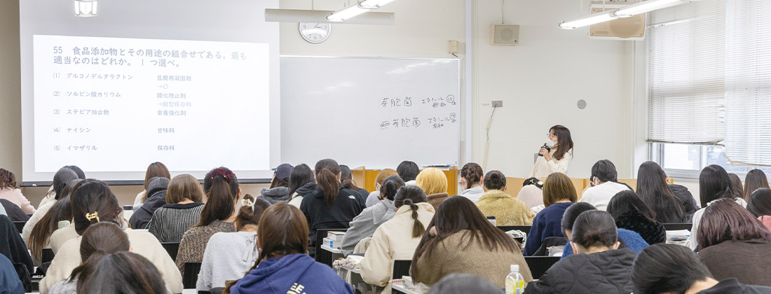 - 各専門科目の担当教員により、過去問題を徹底的に解説することで、管理栄養士国家試験合格のための実力アップを行っています。