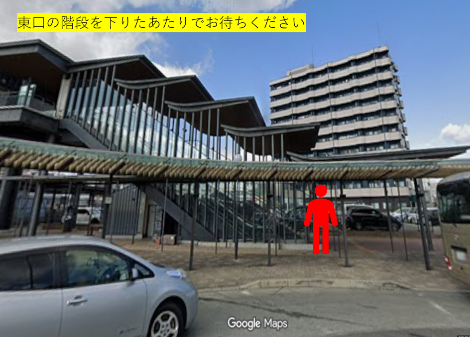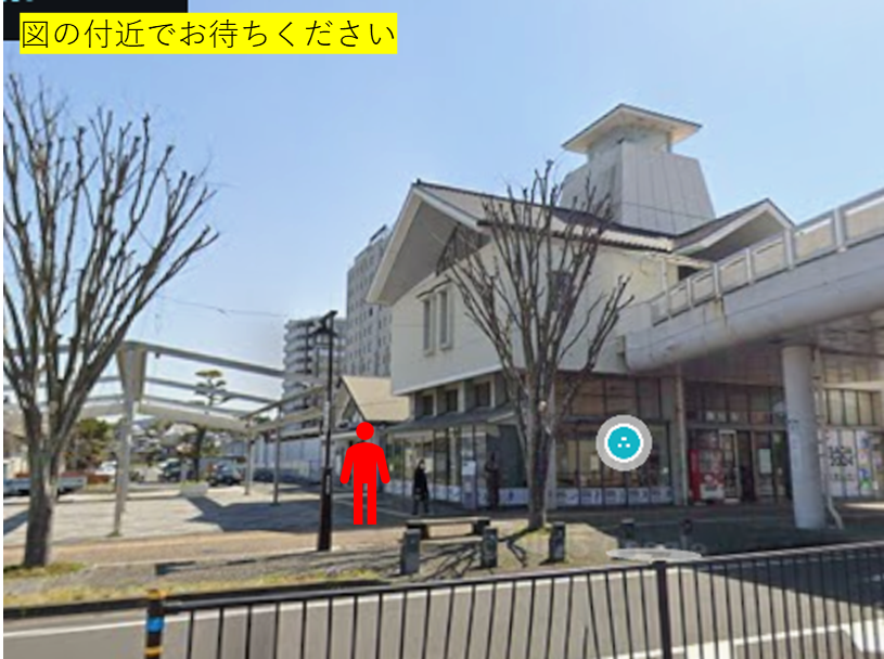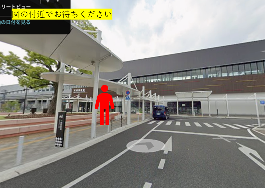 送迎バスは路上駐車します。通行の妨げにならないよう、歩道橋付近の建物寄りでお待ちください。