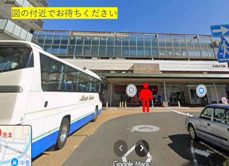 JR唐津駅の南口を出て右側(マンションがある側)に地面が黄色に塗られ「バス」と書かれたエリアがの周辺に集合してください。近くに「西九州大学」の腕章を付けた係がいますので声をかけてください。