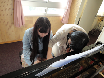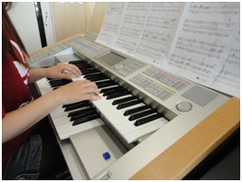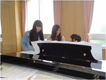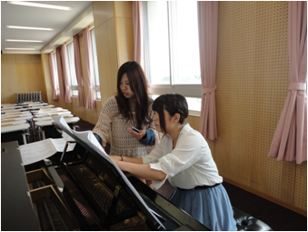 器楽アンサンブルでは、12月の実技発表会を見に来てくださる皆さんに素晴らしい音楽をお届けできるように、日々努力しています。今は、器楽表現などの講義で学んだことを生かしながら、楽譜を作っていきます。まず曲を決め、その後はエレクトーンなどの楽譜をもとに自分たちで編曲していきます。