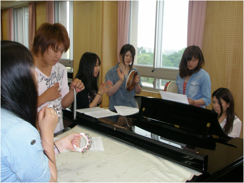 「器楽表現」の授業では、タンバリンやスズなどの子どもでもできる楽器を使った音遊びや、からだ全体を使って音を表現するボディパーカッションなどを行います。このような楽器を使ったリズム遊びや子どもの年齢に応じた編曲の仕方など、保育に役立つスキルを楽しみながら学べる授業です。