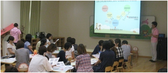 今回の内容は、西田明史先生による保護者対象の講座「子どもの遊びと元気づくり」でした。講座では、家庭における幼児期からの運動習慣づくりの必要性についてお話がありました。また、西田先生の卒業課題研究グループの学生14名が調査した「幼児期の運動発達に対する公園利用の有効性」の結果も報告されました。