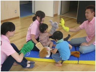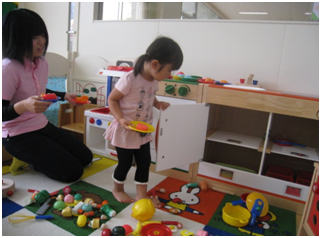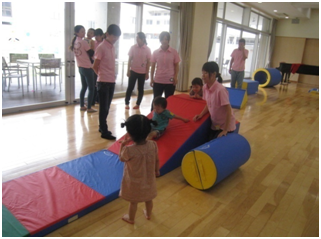 講座が実施されている間、子どもたちは託児担当の学生と一緒に過ごしました。今回がはじめての母子分離ということで、不安な様子の子どもたちもいましたが、母親と離れた環境での遊びにも徐々に慣れ、託児担当学生と一緒にのびのびと安心して遊ぶ姿が見られるようになりました。