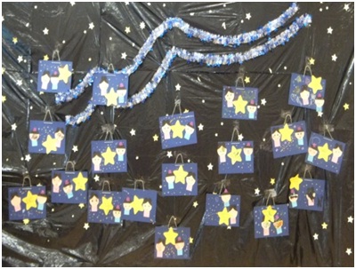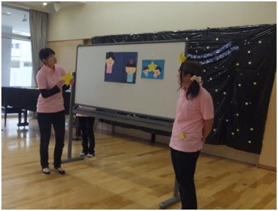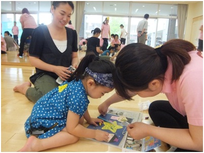 7月5日(金)の第4回目の親子いきいき広場では、七夕製作がありました。はじめに七夕にまつわる劇があり、子どもたちは興味津々で見ていました。次いで、製作遊びでは、おり姫やひこ星の顔を描いたり、星型のシールをたくさん貼ったりして親子や学生と一緒に楽しく活動しました。できた作品を願い事をこめながら大きな夜空に飾りました。自分の作品を見て、親子でほほ笑む姿がたくさん見られました。