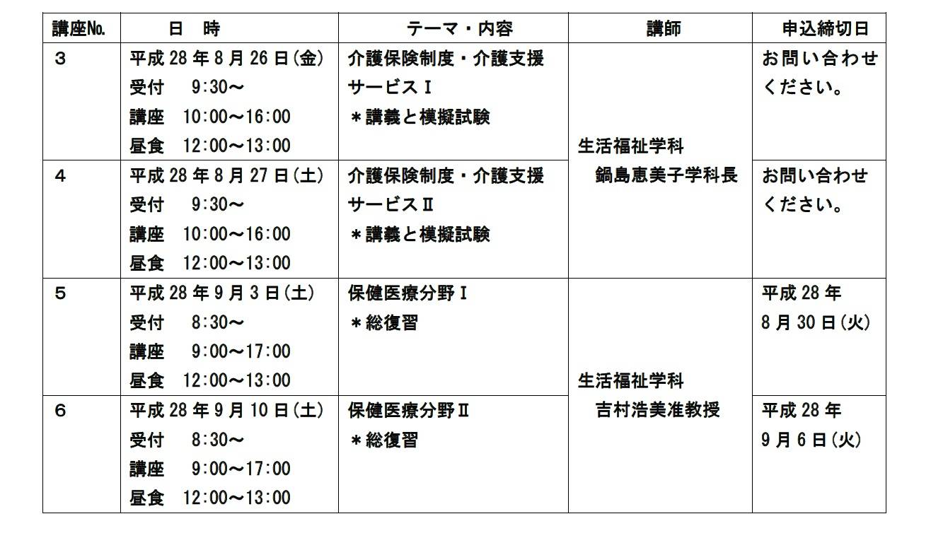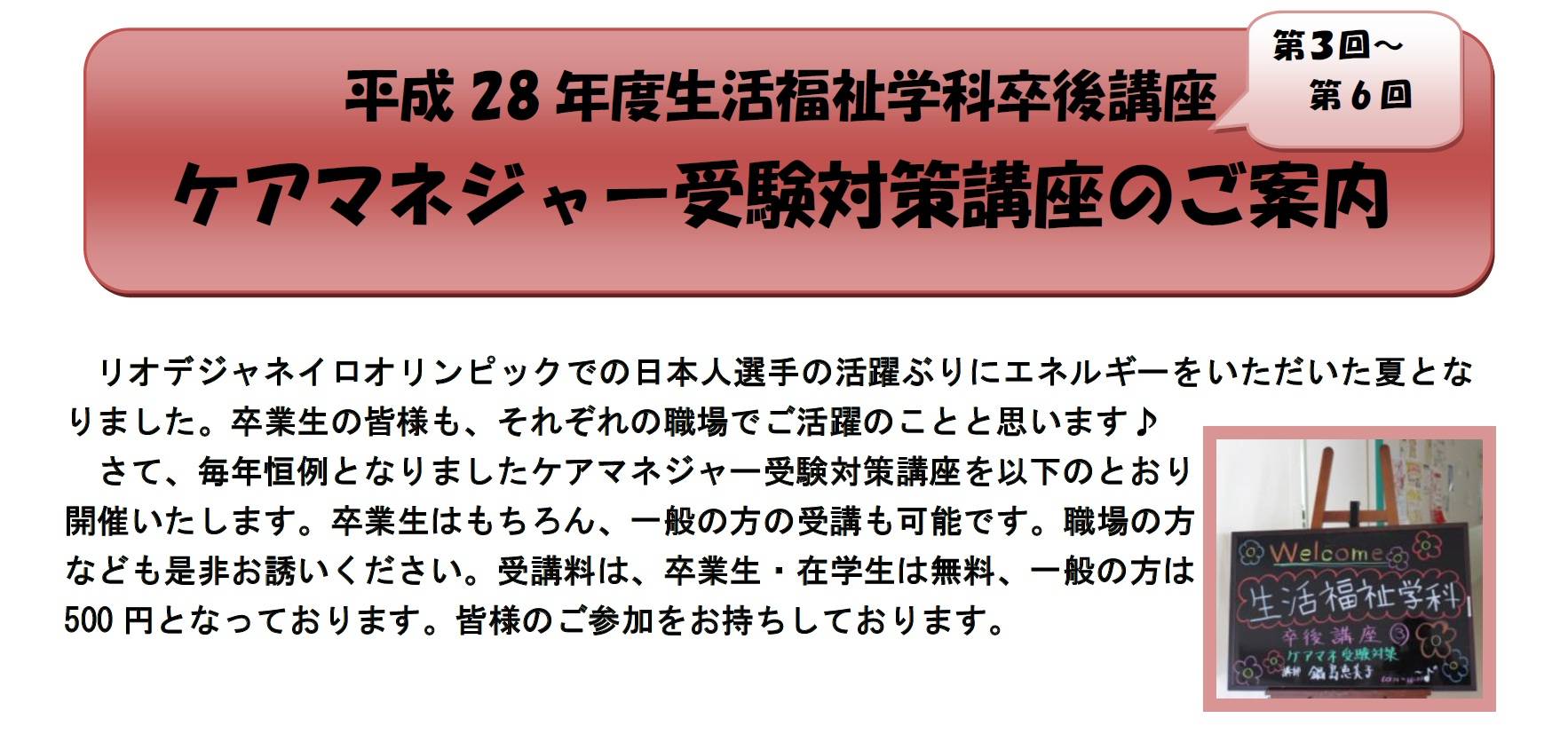 平成28年度生活福祉学科卒後講座第3回~第6回 ケアマネージャー受験対策講座のご案内