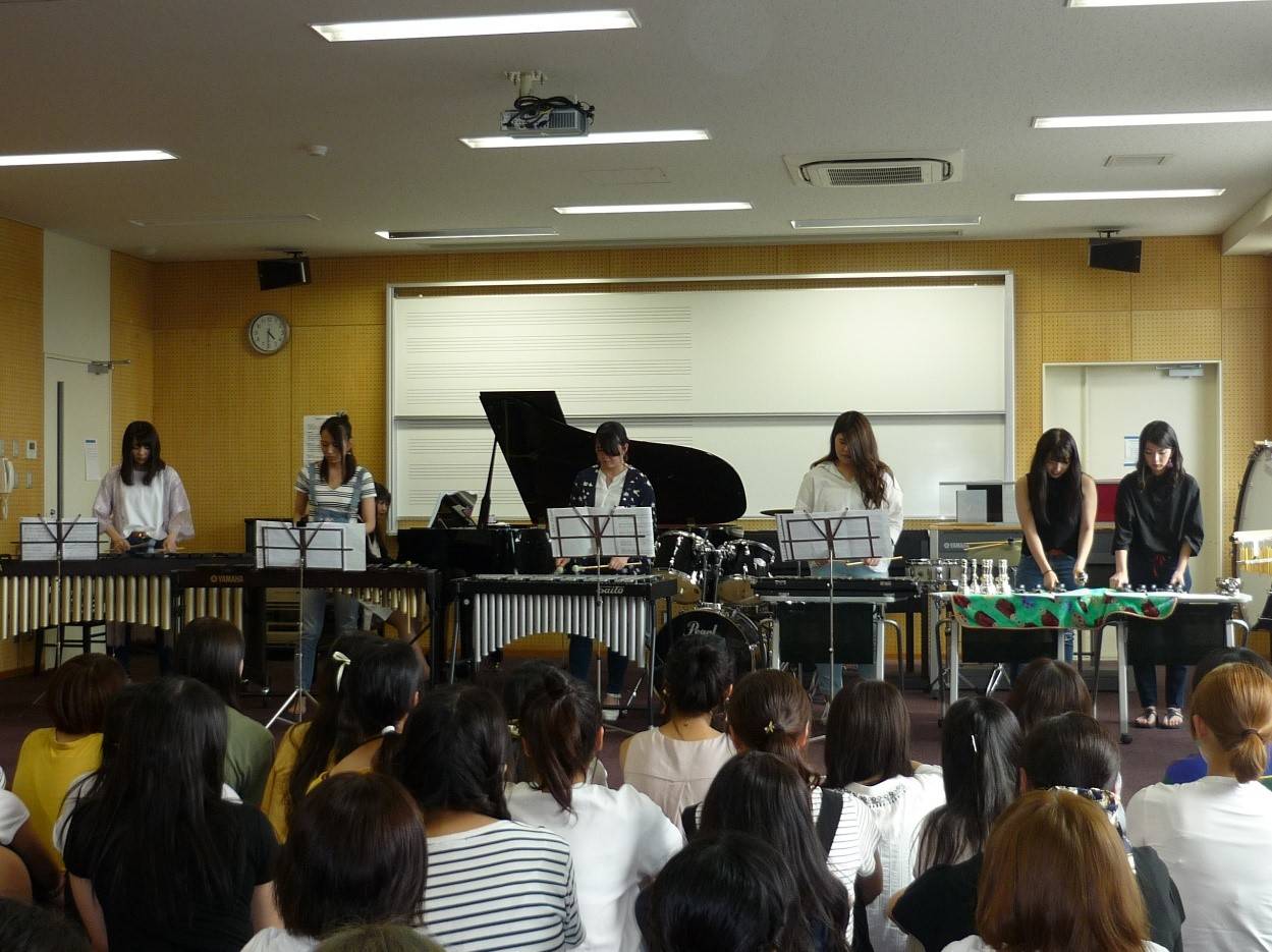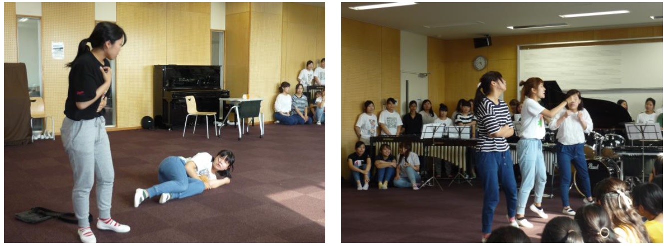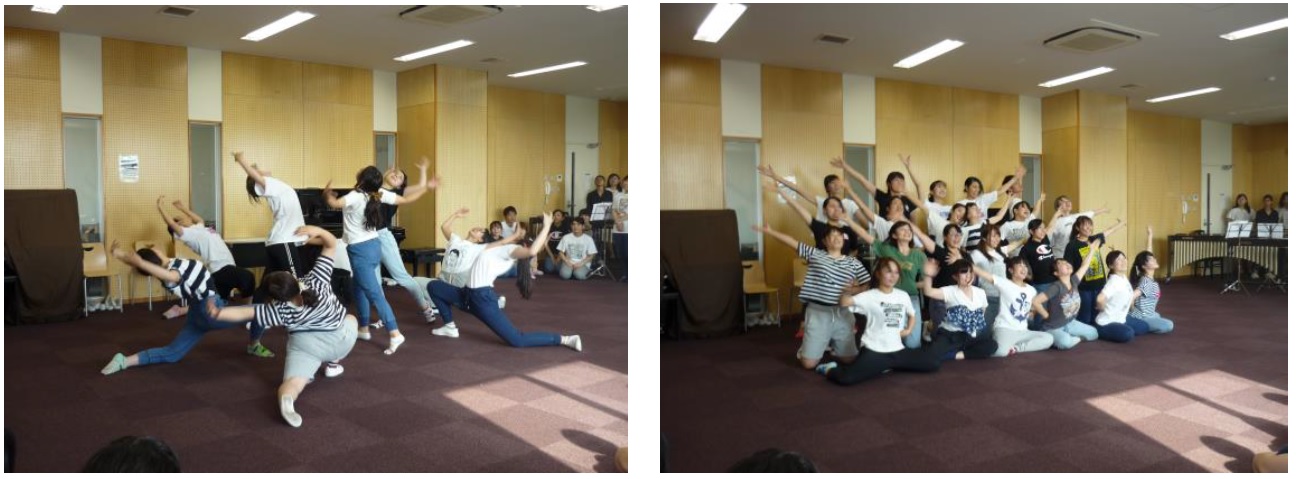 前期試験も近づいてきた7月14日(金)。忙しい合間をぬって、中間発表会を行いました。これは、互いに練習の成果を発表しあい、出た意見をもとに今後の練習に活かしていくことを目的にしています。また、同コースの1年生にも披露することで、1年生がどの演目に加わりたいのか希望調査をする意味もかねています。