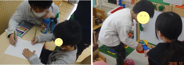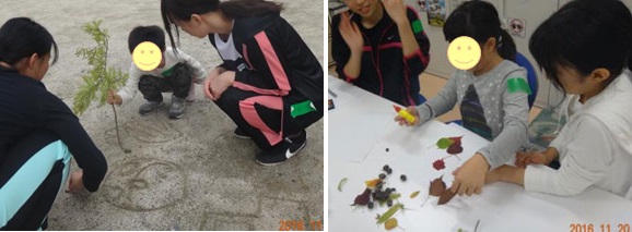 子どもたちは、外に出てお絵描きをしたり、拾った落ち葉で作品を作ったりして、とても楽しそうでした。実習も残り少なくなってきましたが、これからも、よい関係性を深めていけるといいですね。