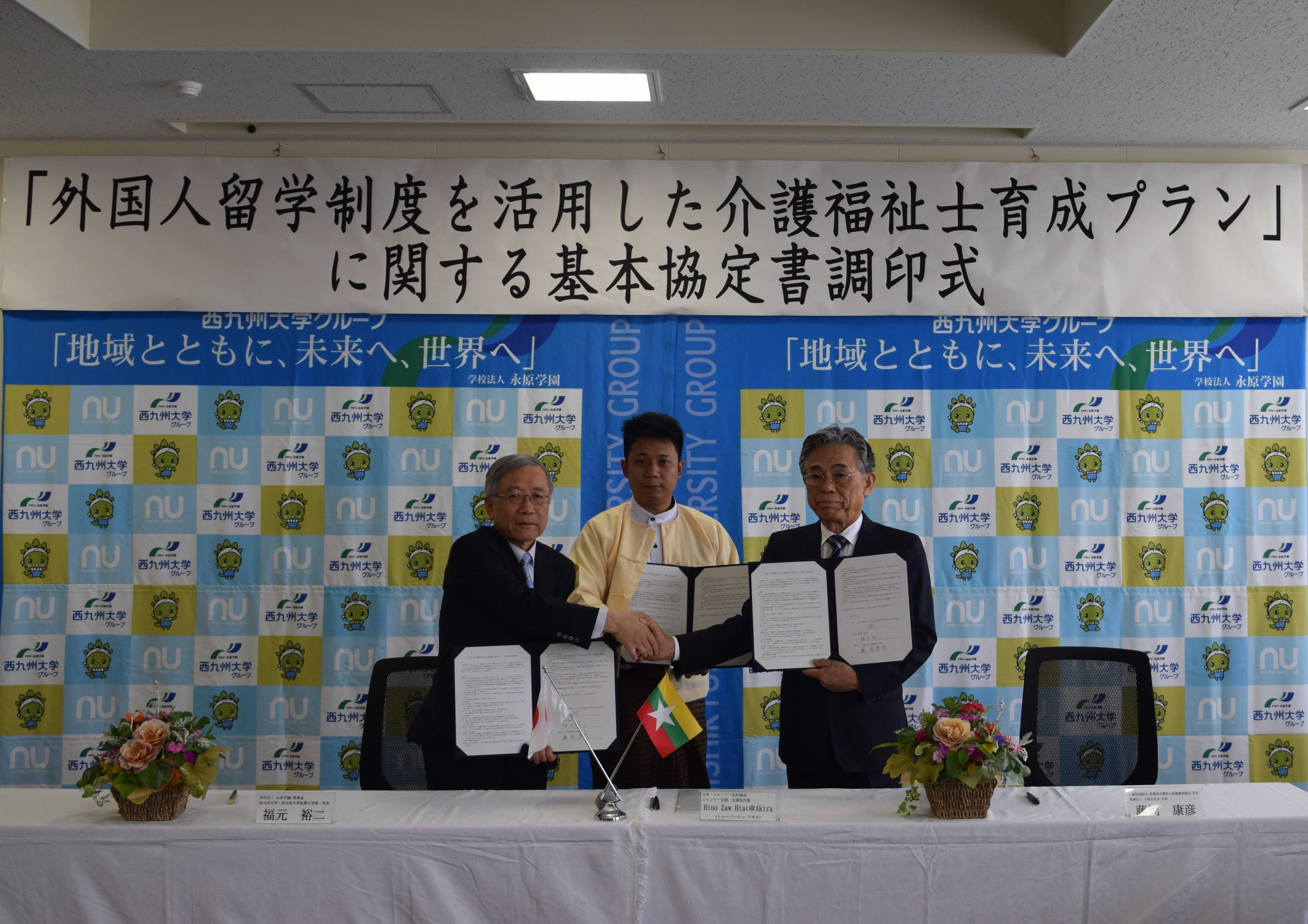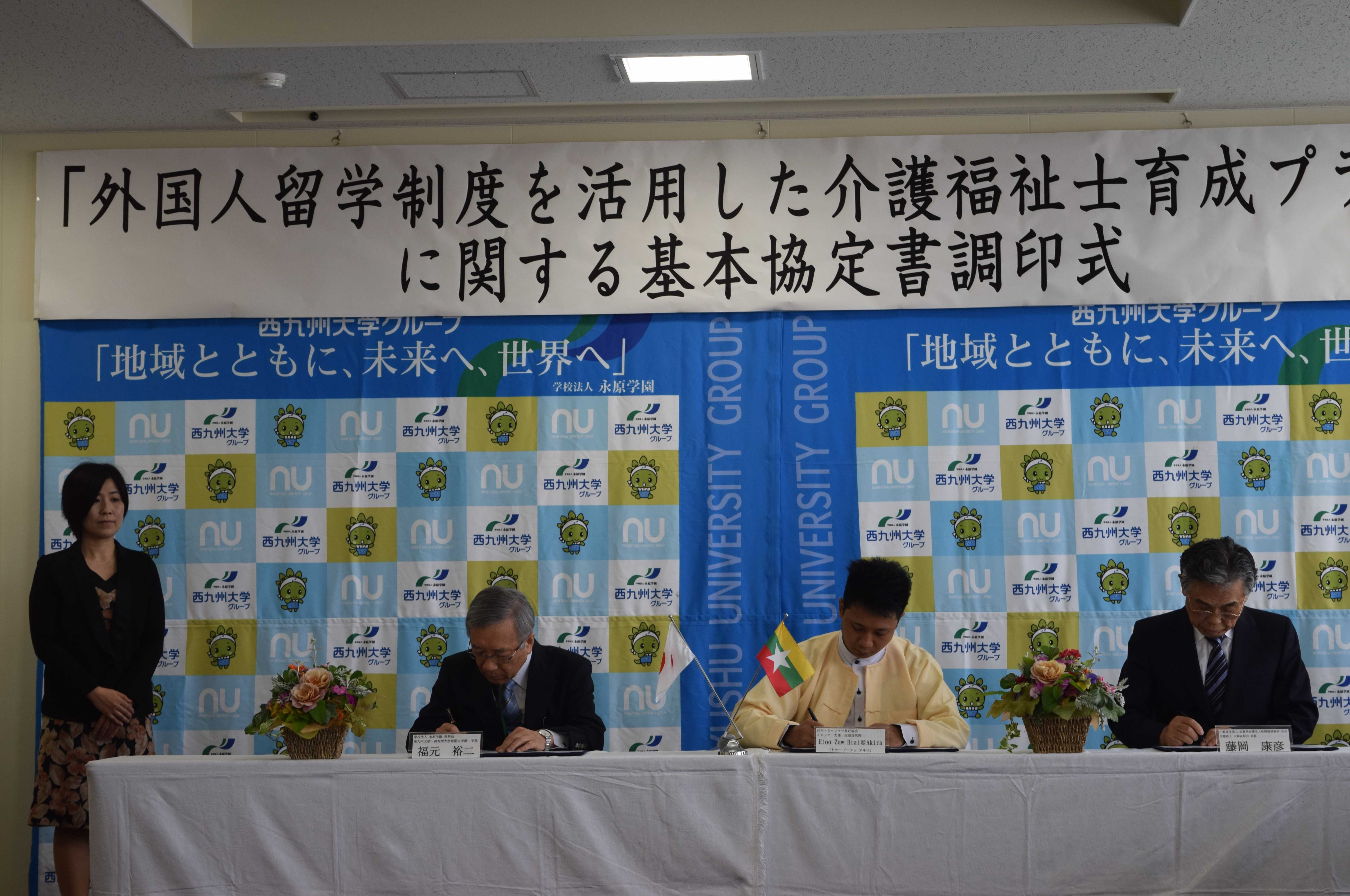 平成29年5月11日(木)に西九州大学佐賀キャンパスにて日本ミャンマー友好協会(ミャンマー支部)、佐賀県介護老人保健施設協会及び本学との「外国人留学制度を活用した介護福祉士育成プラン」に関する基本協定書調印式が執り行われました。