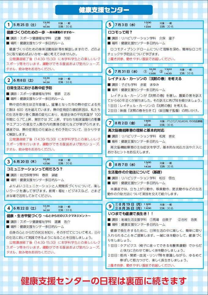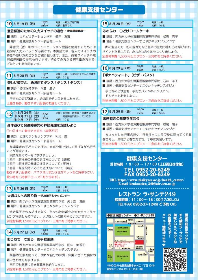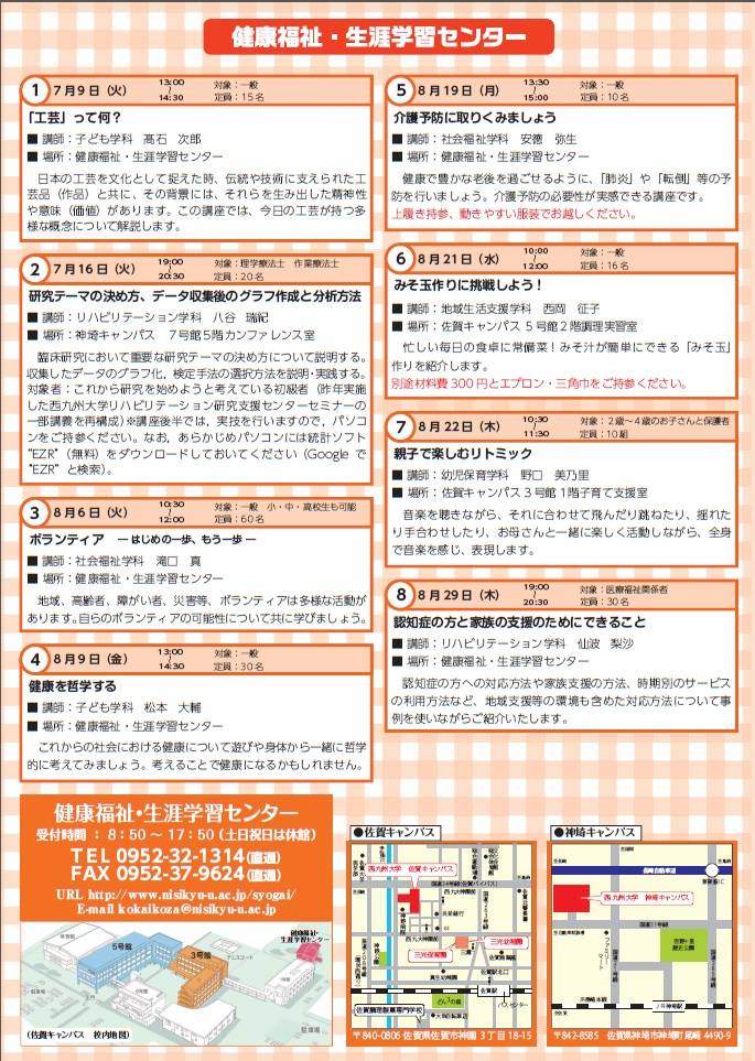 会場は、西九州大学短期大学部キャンパス内「健康福祉・生涯学習センター」のほか、佐賀市水ケ江・佐賀メディカルセンター(旧好生館跡)内「健康支援センター 」、西九州大学神埼キャンパスのいずれかとなっています。