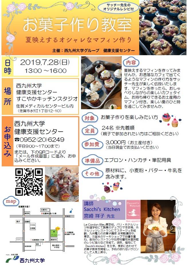 西九州大学グループ健康支援センターでは7月28日(日)に予約の取れないサロン「Sacchi’s Kitchen」の宮崎祥子先生を講師にむかえ、夏映えするマフィンを作るお菓子作り教室を開催致します