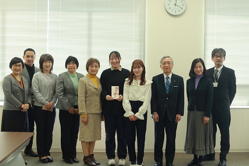 12月22日(水)、本学において令和3年度同窓会学生支援金の授与式が行われました。西九州大学短期大学部 同窓会より丹羽会長、西岡事務局長、馬場先生、立川先生が出席され、本学から福元学長、平田副学長、野口幼児保育学科学科長、学友会より会長の谷村さん、副会長の百武さんが出席しました。