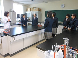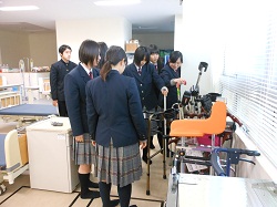 新しくできたばかりの理化学実験室や介護実習室では、実験器具や介護用品を実際に手に取り、興味津々な様子で説明に聞き入っていました。
