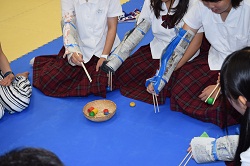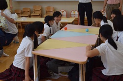 施設見学では、ML教室の見学後、急遽ではありますが、保育演習室と子育て支援室で行われていた「障害児保育」の授業に参加していただき、学生と一緒にゲームを楽しみました。