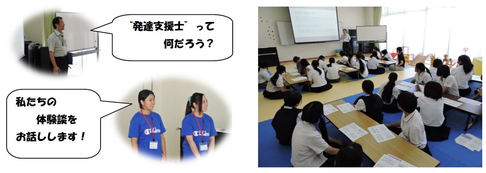 占部先生の講座では、本学で取得できる認定資格「発達支援士(基礎)」について、実際にプログラムを受講した先輩の体験談を交えて説明がありました。発達障害等のある子どもの困り感に気づき、子どもによりそった支援ができる保育士や幼稚園教諭の養成に取り組んでいます。