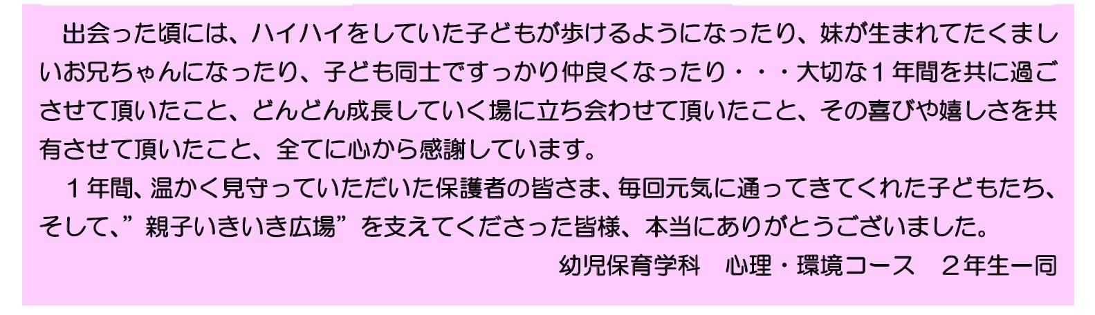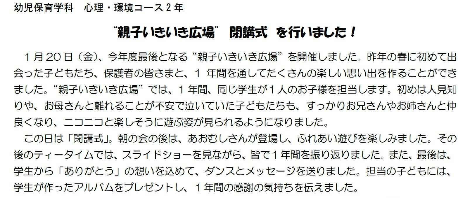 幼児保育学科 心理・環境コース2年 “親子いきいき広場”閉講式を行いました!