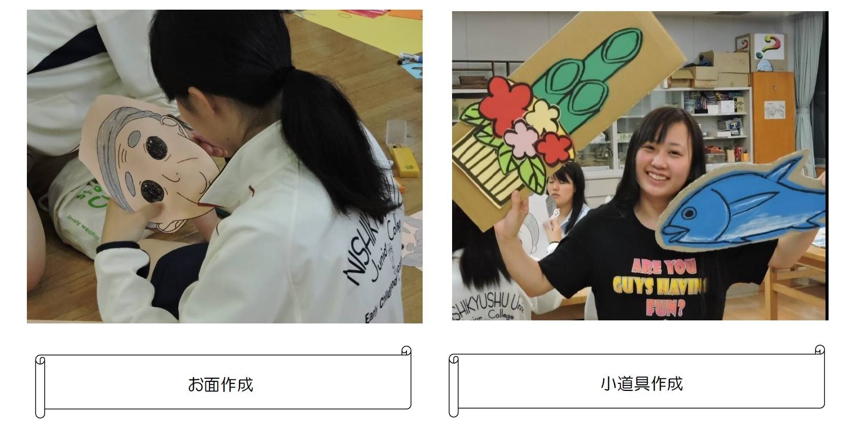 特に、保育研修(絵本を使った劇活動)では、劇のためのお面や衣装の作成、セリフを覚え、動きの練習をし、発表することを通して、限られた時間の中でグループとして一定の成果を上げるために何が必要かを体験的に学ぶ良い機会になったようです