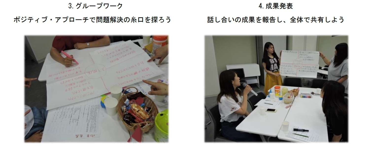 今回のテーマは、「保育者・社会人としてのキャリアアップに向けて」です。卒業後2ヵ月余りの自分たちの職業生活を振り返り、現状を共有するとともに、ポジティブ・アプローチを用いて、困っていることや悩みの解決に向けて、皆で話し合い、自分たちが明日からできることを探っていきました。
