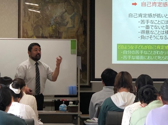 最初に九州龍谷短期大学の鬼塚先生が基礎研修をされました。これまでの先生の臨床経験の中で出会った多くの事例を通してとても分かりやすく障害の基礎について説明していただきました。学生はそれぞれメモしたり、じっと話に耳を傾けたりととても集中して受講していました。