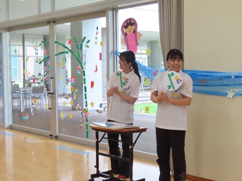 小さなお友達にも分かるように、学生がペープサートで七夕のお話をしました。