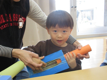 楽器を作った後は、学生が廃材で作って準備した「ギター」や「マラカス」、「たいこ」など廃材の特性を活かしながら様々な音を楽しんでもらえるようなブースを準備しました。