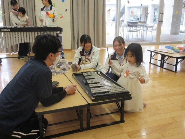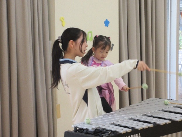 自由に楽器に触れる中で、学生たちも楽器で演奏するなどして子どもたちをひきつけていました。