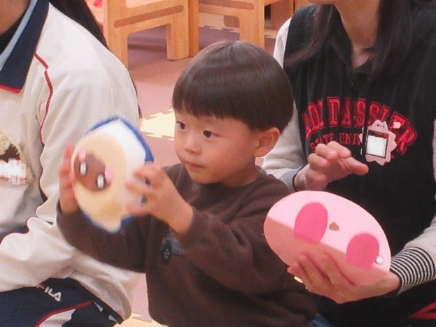その後、親子で「カスタネット」や「タンバリン」といった楽器を紙皿やペットボトルキャップ、アイロンビーズなどを使って作りました。カスタネットづくりではうさぎさんにタンバリンづくりではたぬきさんと、子どもたちに興味を持ってもらえるような工夫をしながら、出来上がった楽器がどんな音がするのか音を鳴らしながら親子で楽しんでいる様子がみられました。