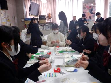 まず敬徳高校では、紙皿コマや紙皿ひこうきづくりを体験させていただきながら、活動内容の紹介や制作のポイントについて共有しました。高校生と短大生が同じテーブルで制作を体験しながら、当日の活動について具体的なイメージを持つ時間となりました。