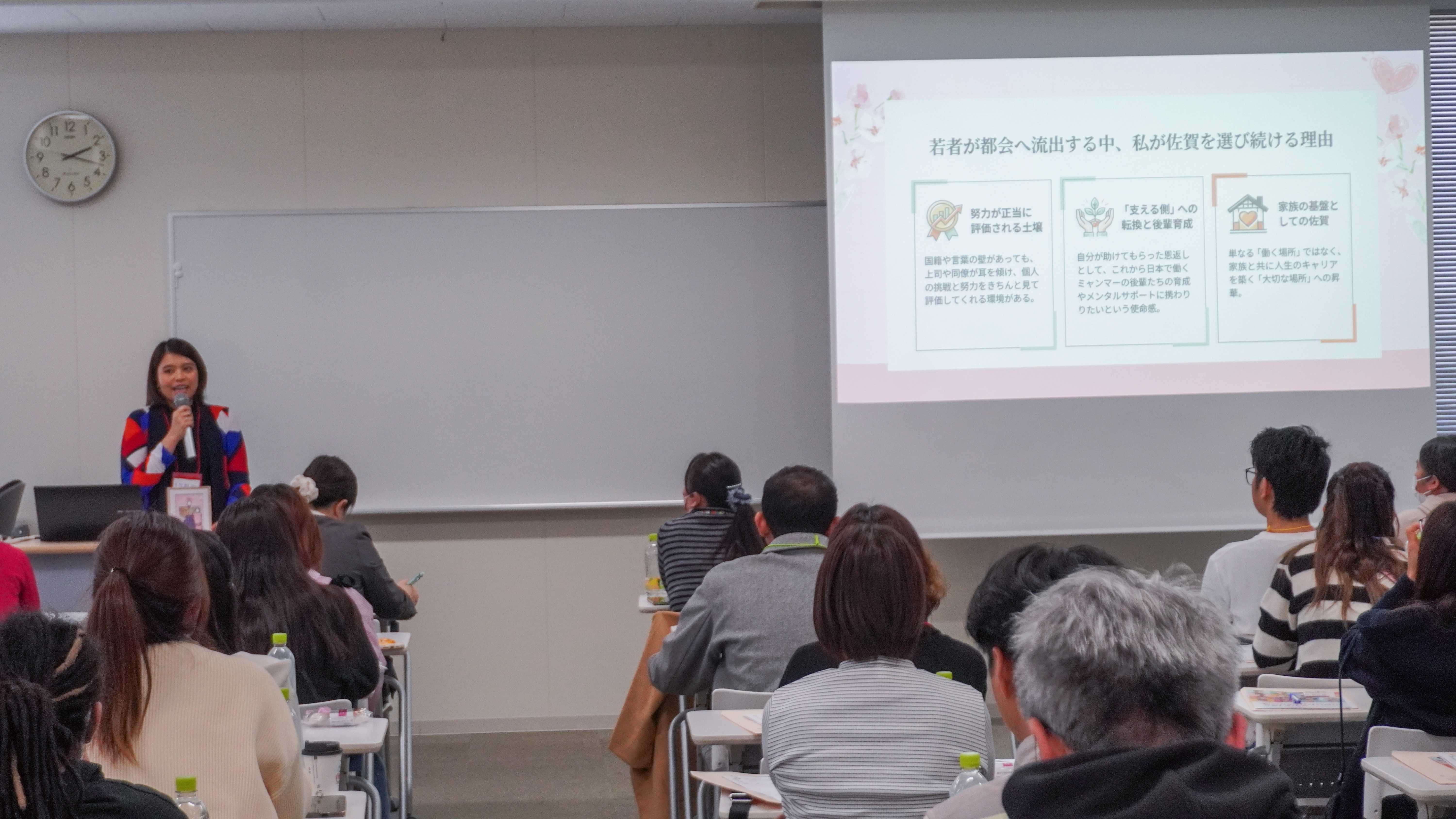 当日は、佐賀県内の介護施設で働く介護福祉士による体験発表や、参加者同士のグループ意見交換が行われました。