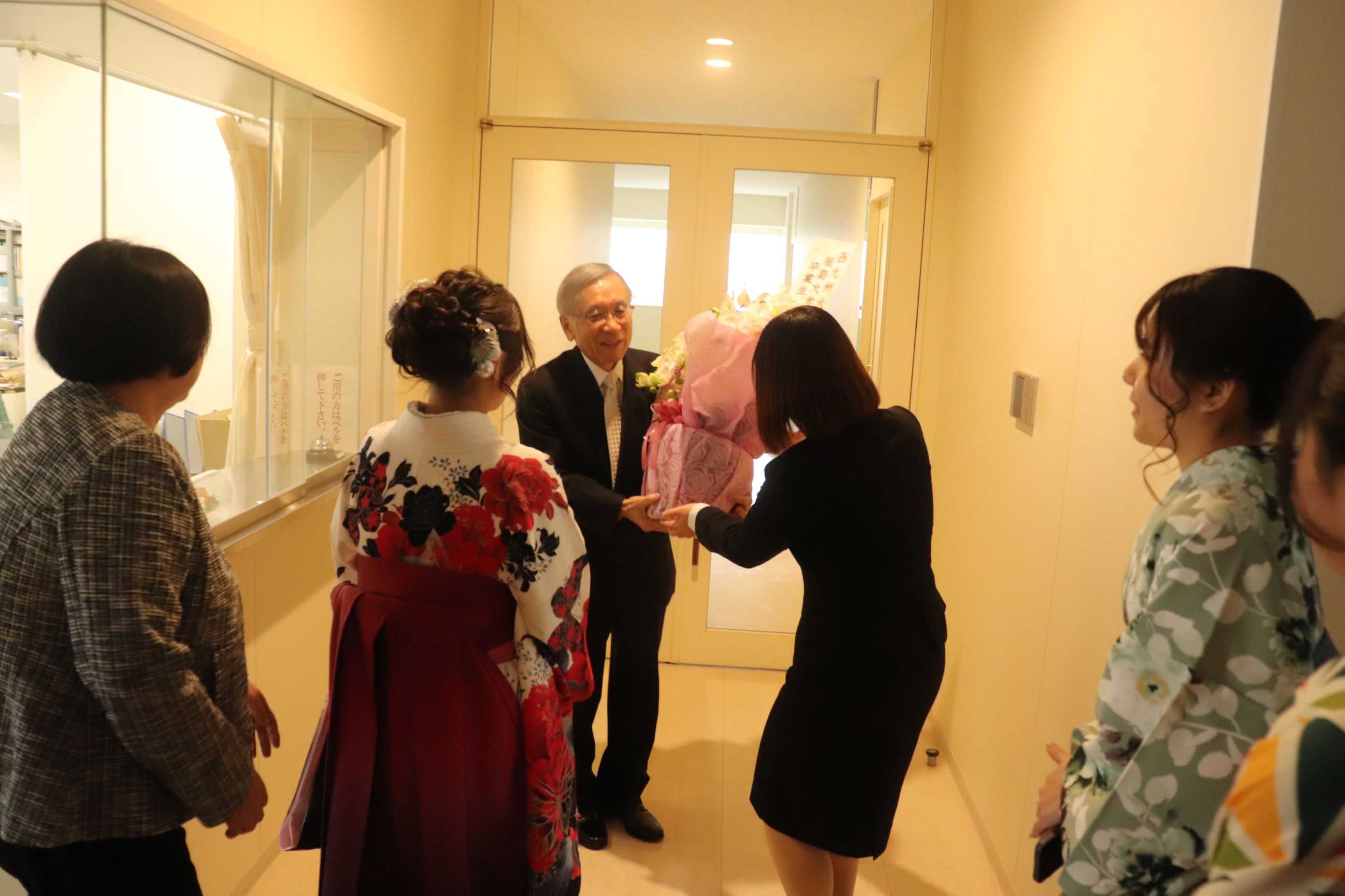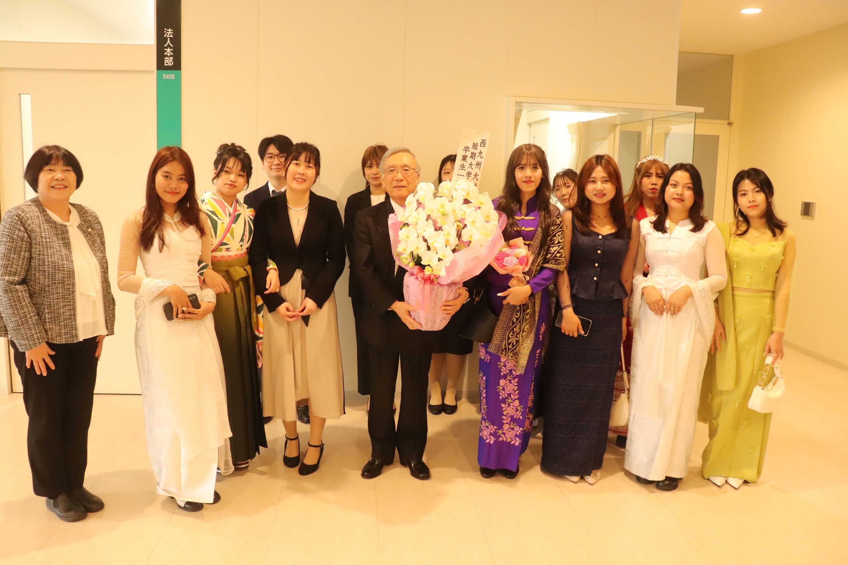 授与式後は大学へ戻り、卒業生代表者が福元裕二学長先生に記念品をお渡ししました。