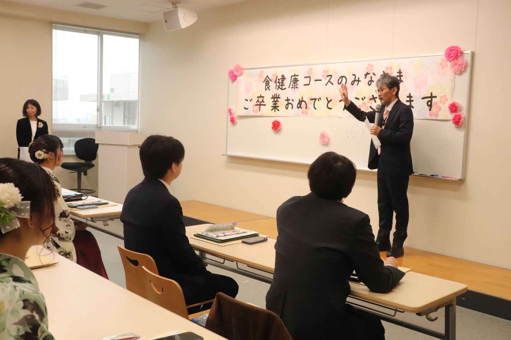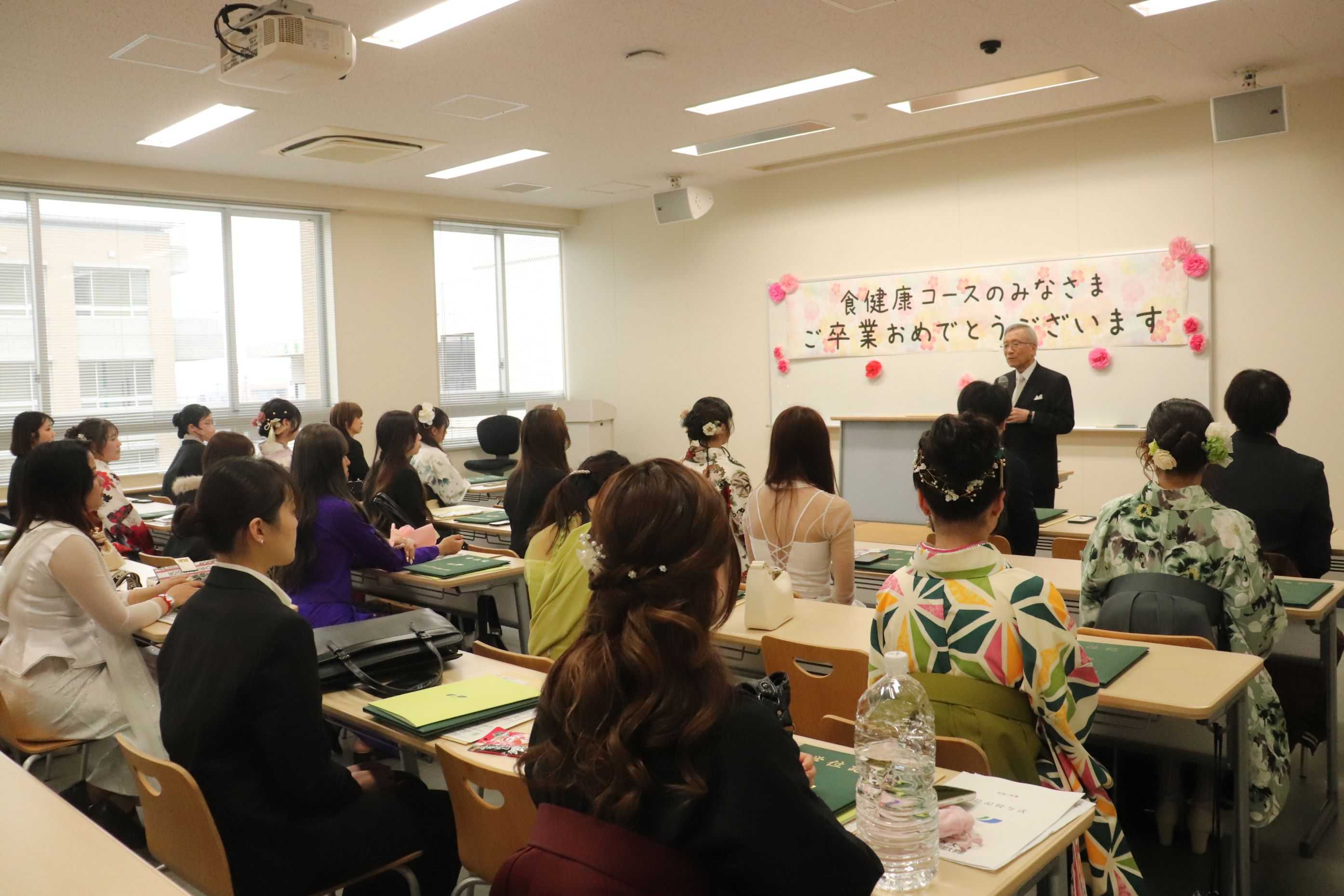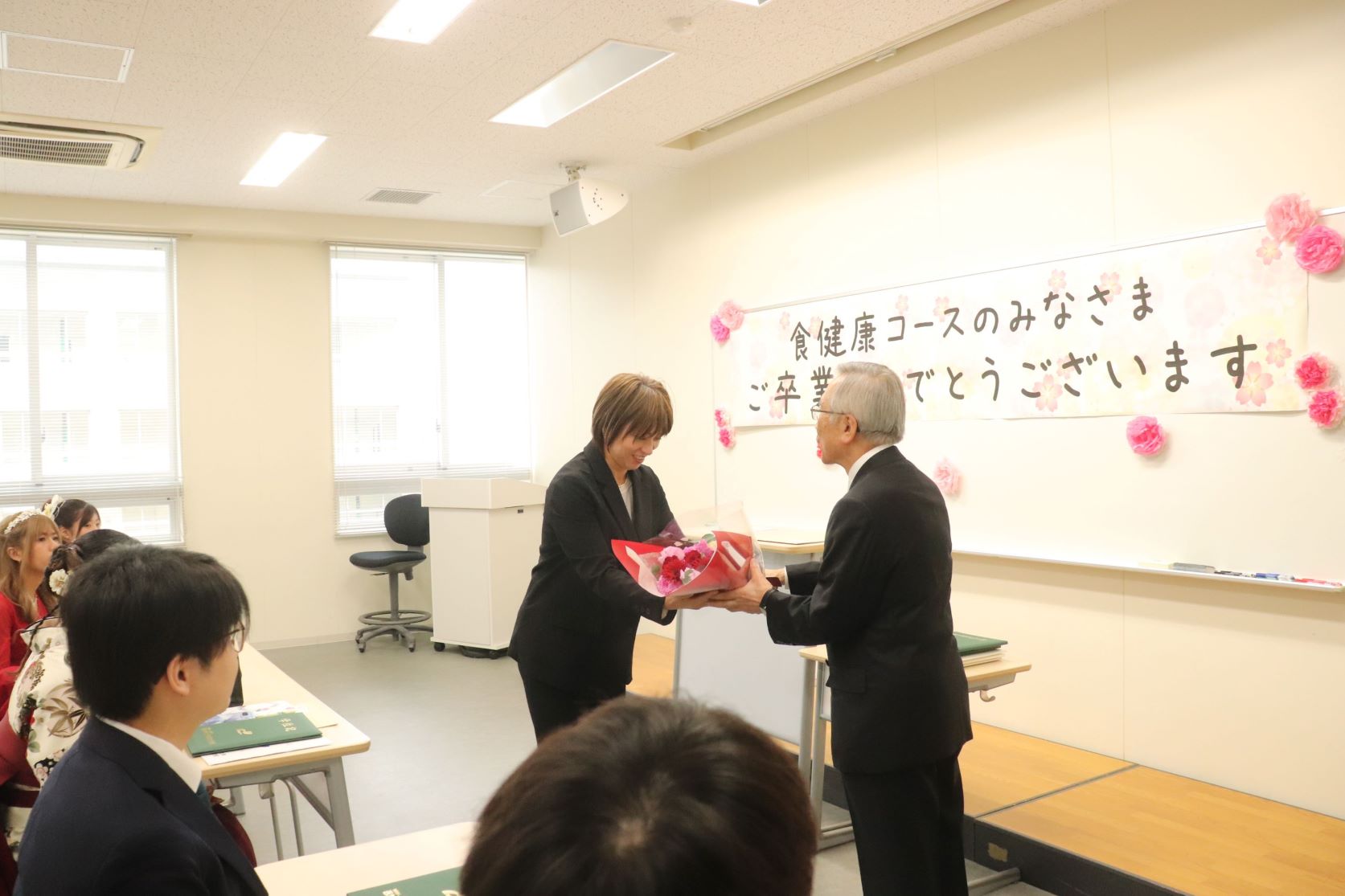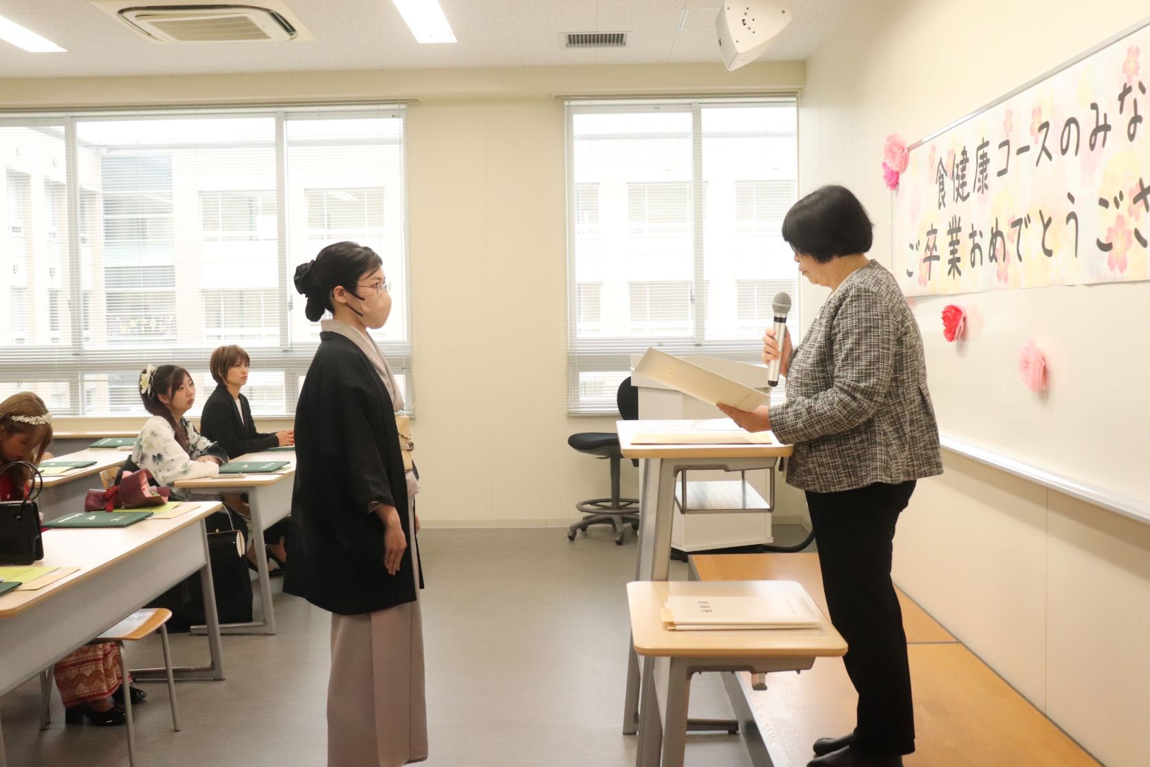 担任の西岡先生より、卒業生一人ひとりに学位記が授与され、栄養士実力認定試験の優秀賞と優良賞の表彰もあわせて行われました。